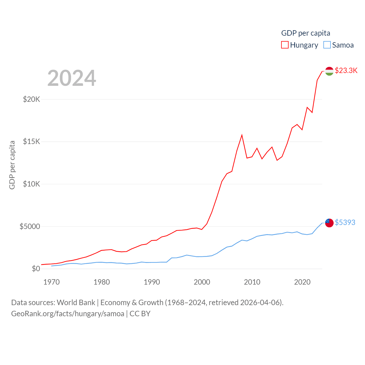 By GDP, Hungary ranks 55/197 ($223B) and Samoa ranks 185/197 ($1.18B). By GDP per capita, Hungary ranks 55/197 ($23,292), while Samoa ranks 117/197 ($5,393).