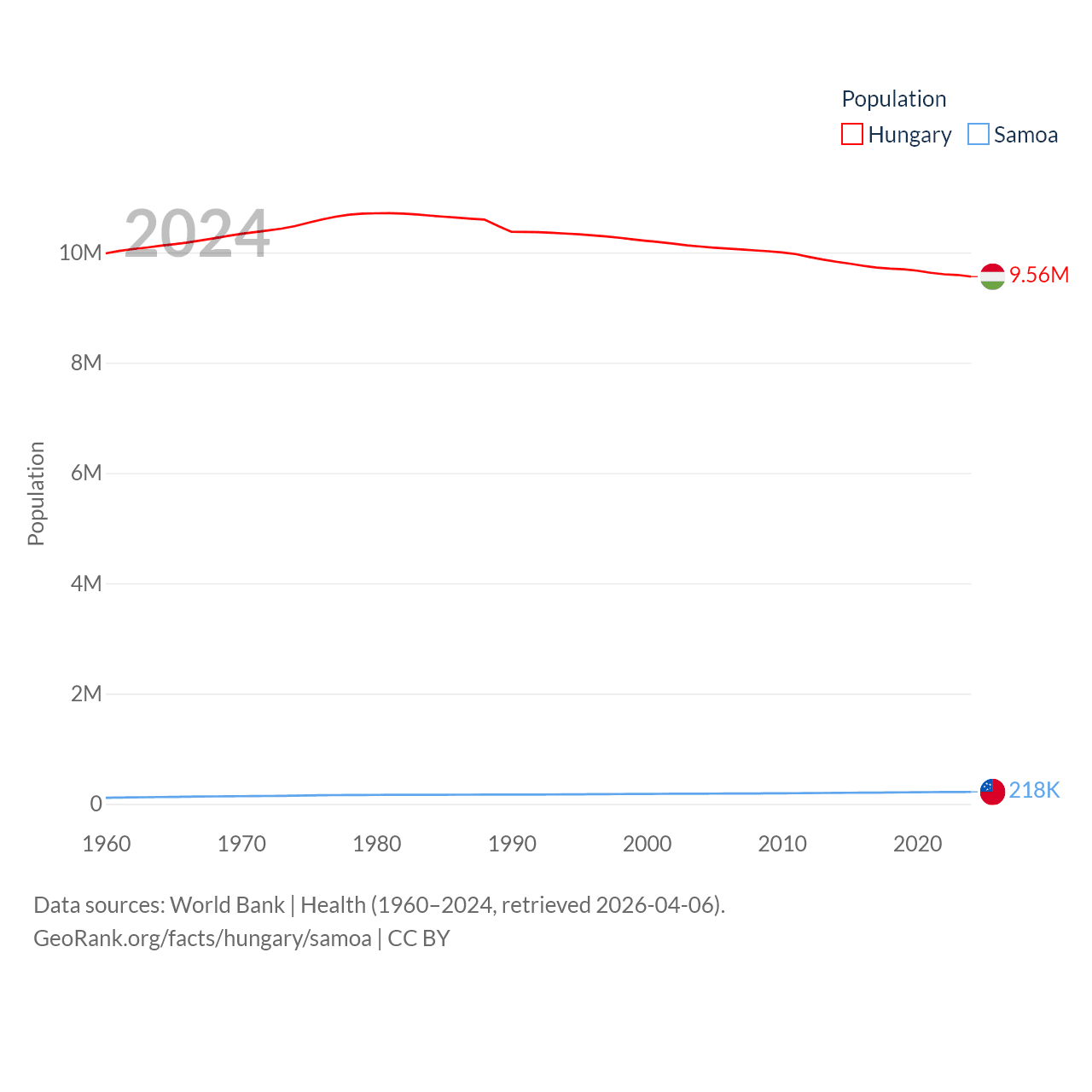 Hungary has a population of 9.56M (ranked 97/197), compared with 218K in Samoa (ranked 177/197). Hungary's land area is 35,236 sq mi versus 1,073 sq mi for Samoa (ranked 109th vs. 168th).