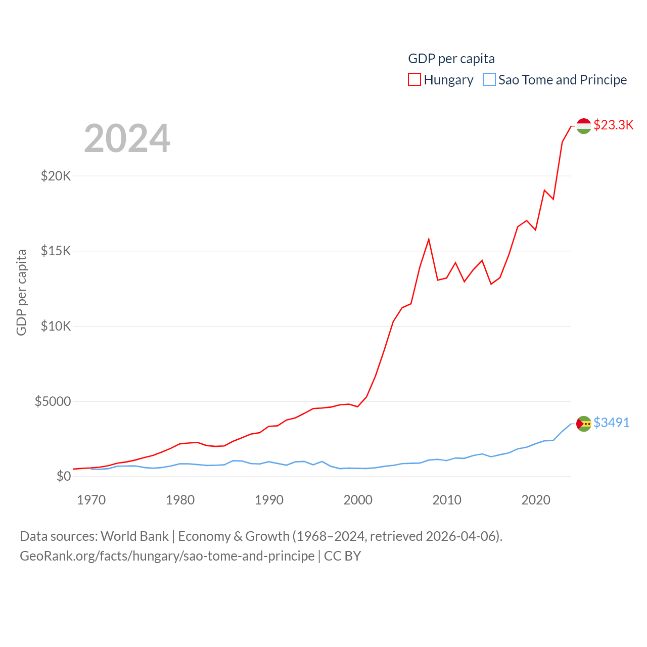 By GDP, Hungary ranks 55/197 ($223B) and Sao Tome and Principe ranks 189/197 ($822M). By GDP per capita, Hungary ranks 55/197 ($23,292), while Sao Tome and Principe ranks 134/197 ($3,491).