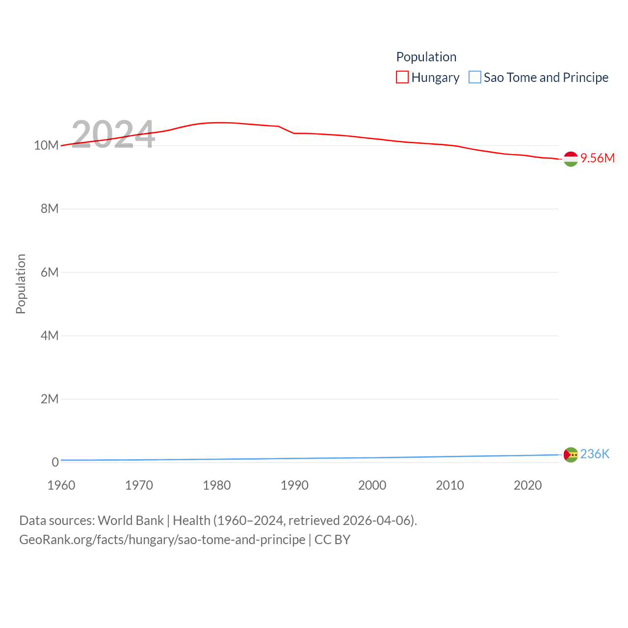 Hungary has a population of 9.56M (ranked 97/197), compared with 236K in Sao Tome and Principe (ranked 176/197). Hungary's land area is 35,236 sq mi versus 371 sq mi for Sao Tome and Principe (ranked 109th vs. 172nd).