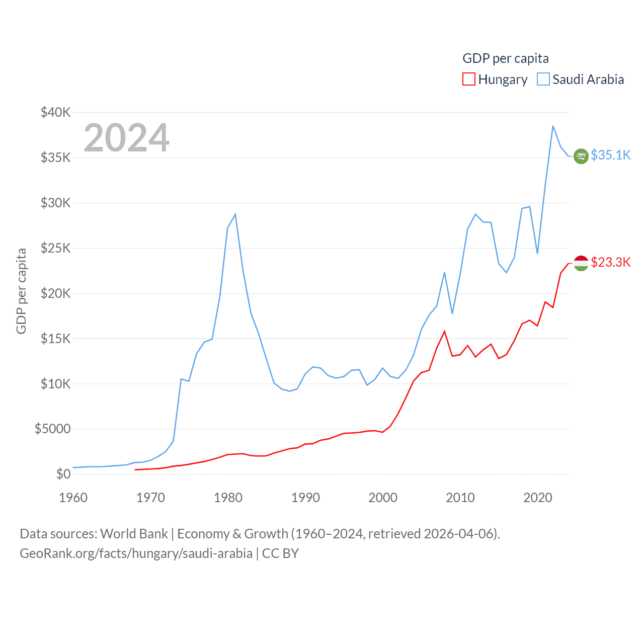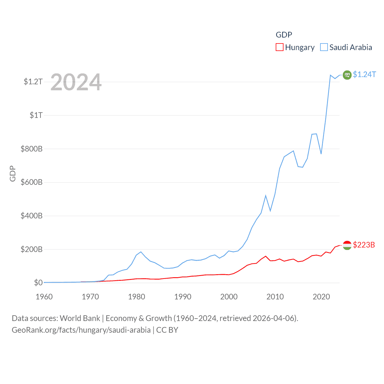 By GDP, Hungary ranks 55/197 ($223B) and Saudi Arabia ranks 18/197 ($1.24T). By GDP per capita, Hungary ranks 55/197 ($23,292), while Saudi Arabia ranks 33/197 ($35,122).