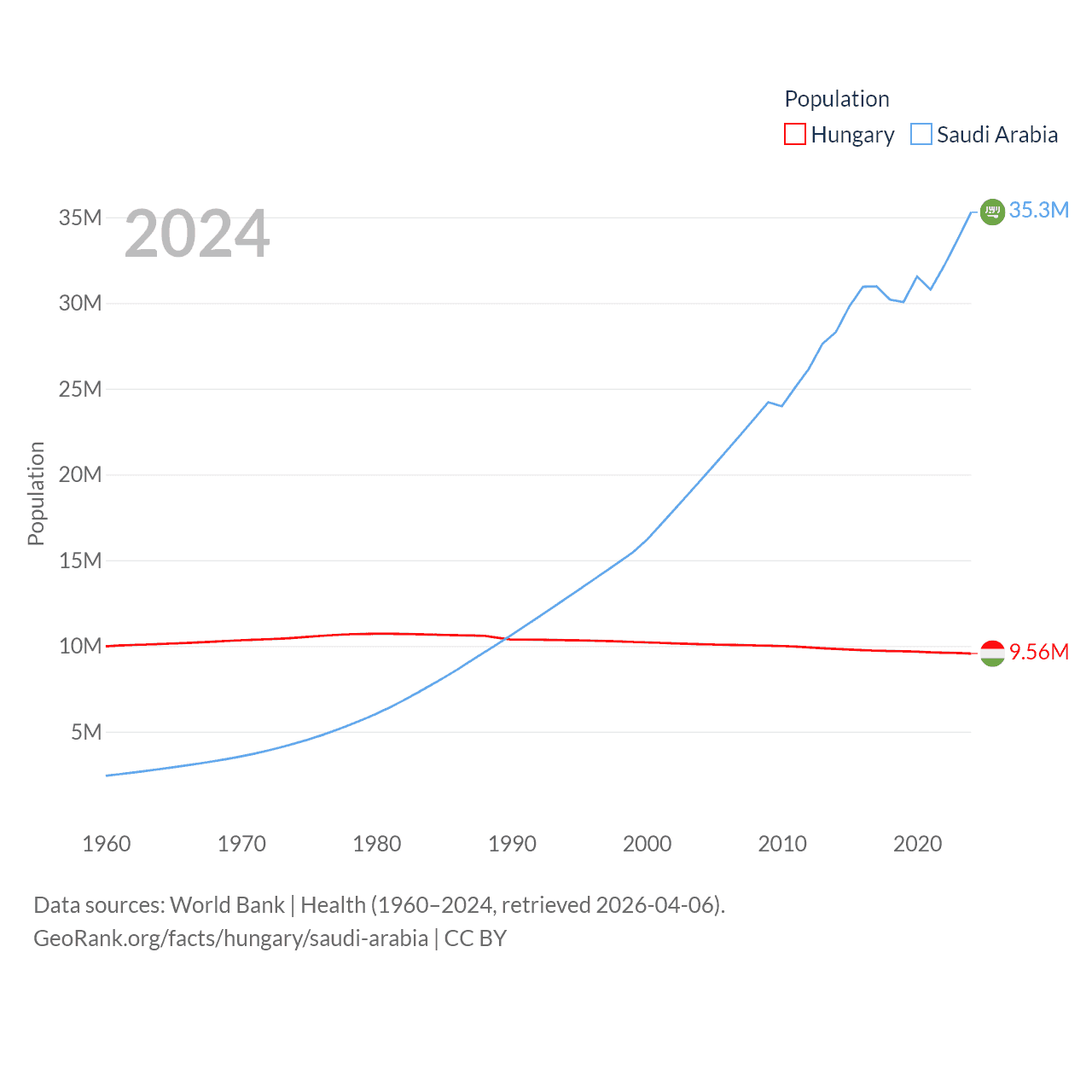 Hungary has a population of 9.56M (ranked 97/197), compared with 35.3M in Saudi Arabia (ranked 45/197). Hungary's land area is 35,236 sq mi versus 830,000 sq mi for Saudi Arabia (ranked 109th vs. 12th).