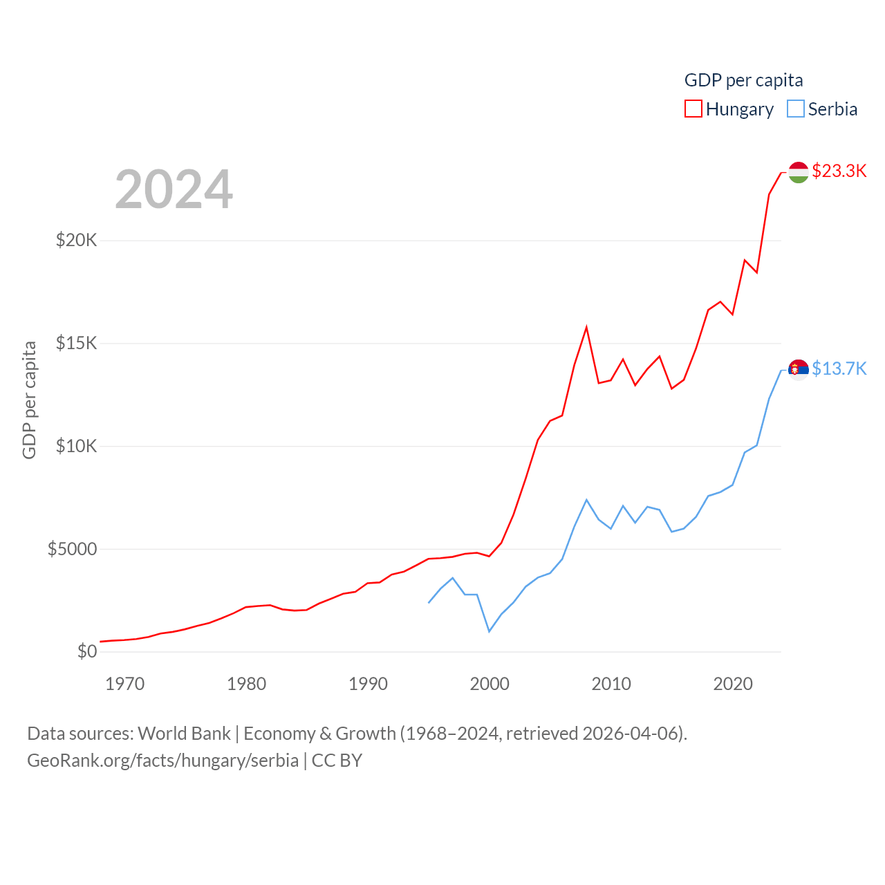 By GDP, Hungary ranks 55/197 ($223B) and Serbia ranks 76/197 ($90.1B). By GDP per capita, Hungary ranks 55/197 ($23,292), while Serbia ranks 73/197 ($13,679).