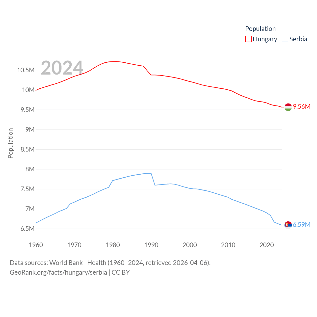 Hungary has a population of 9.56M (ranked 97/197), compared with 6.59M in Serbia (ranked 109/197). Hungary's land area is 35,236 sq mi versus 32,467 sq mi for Serbia (ranked 109th vs. 111th).