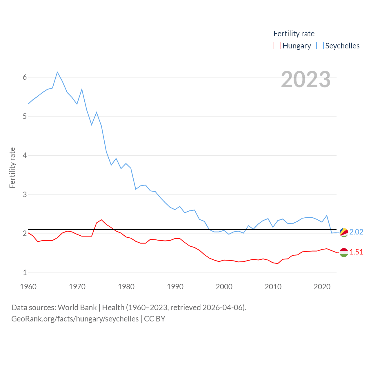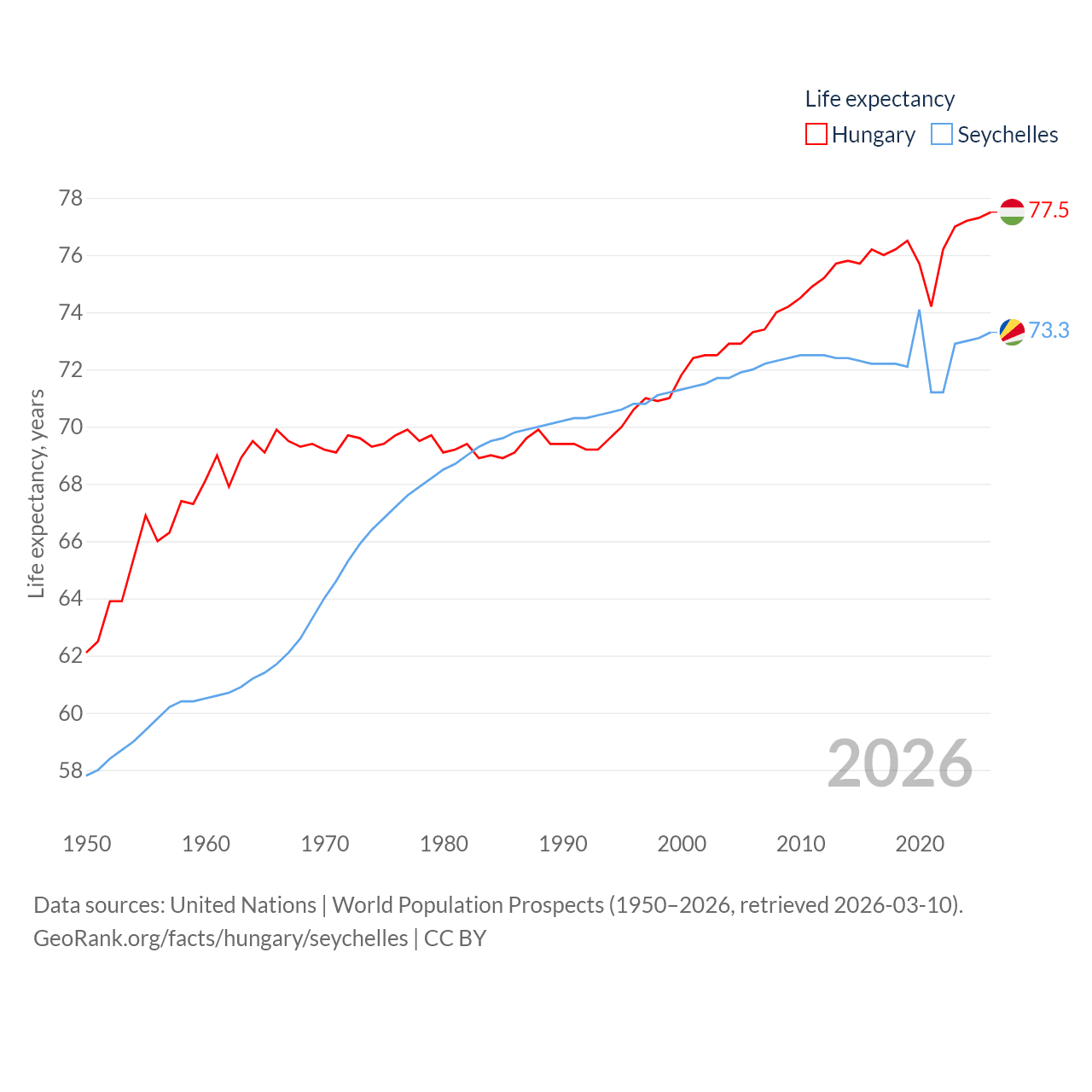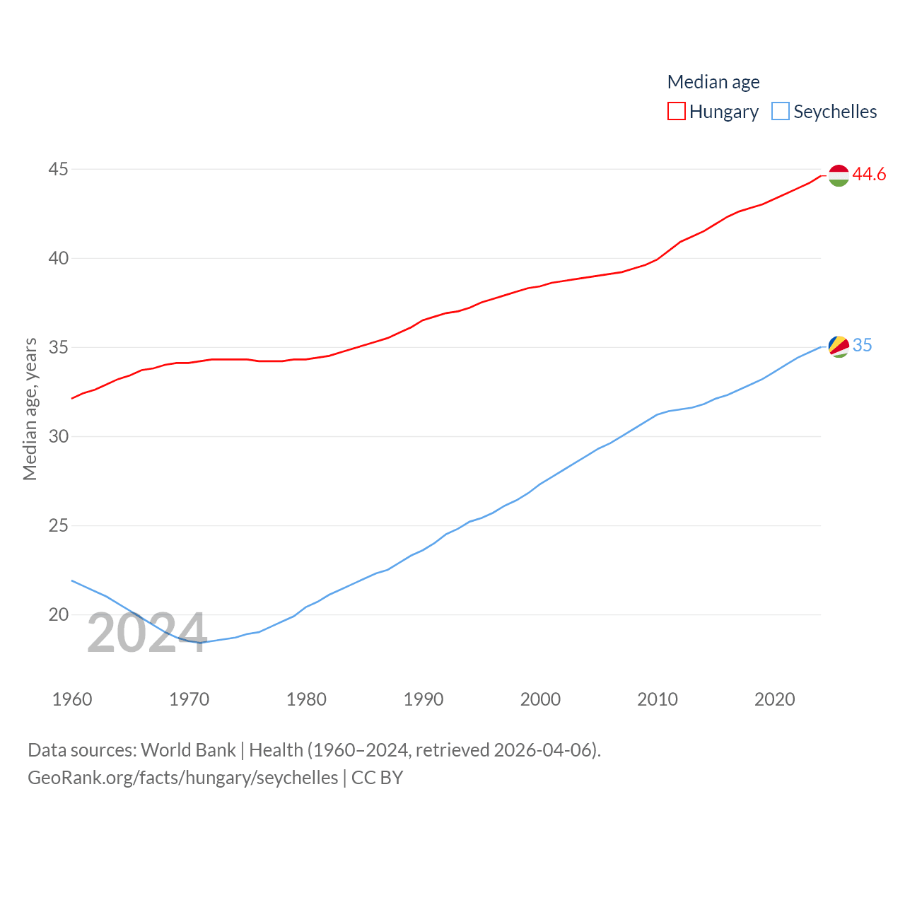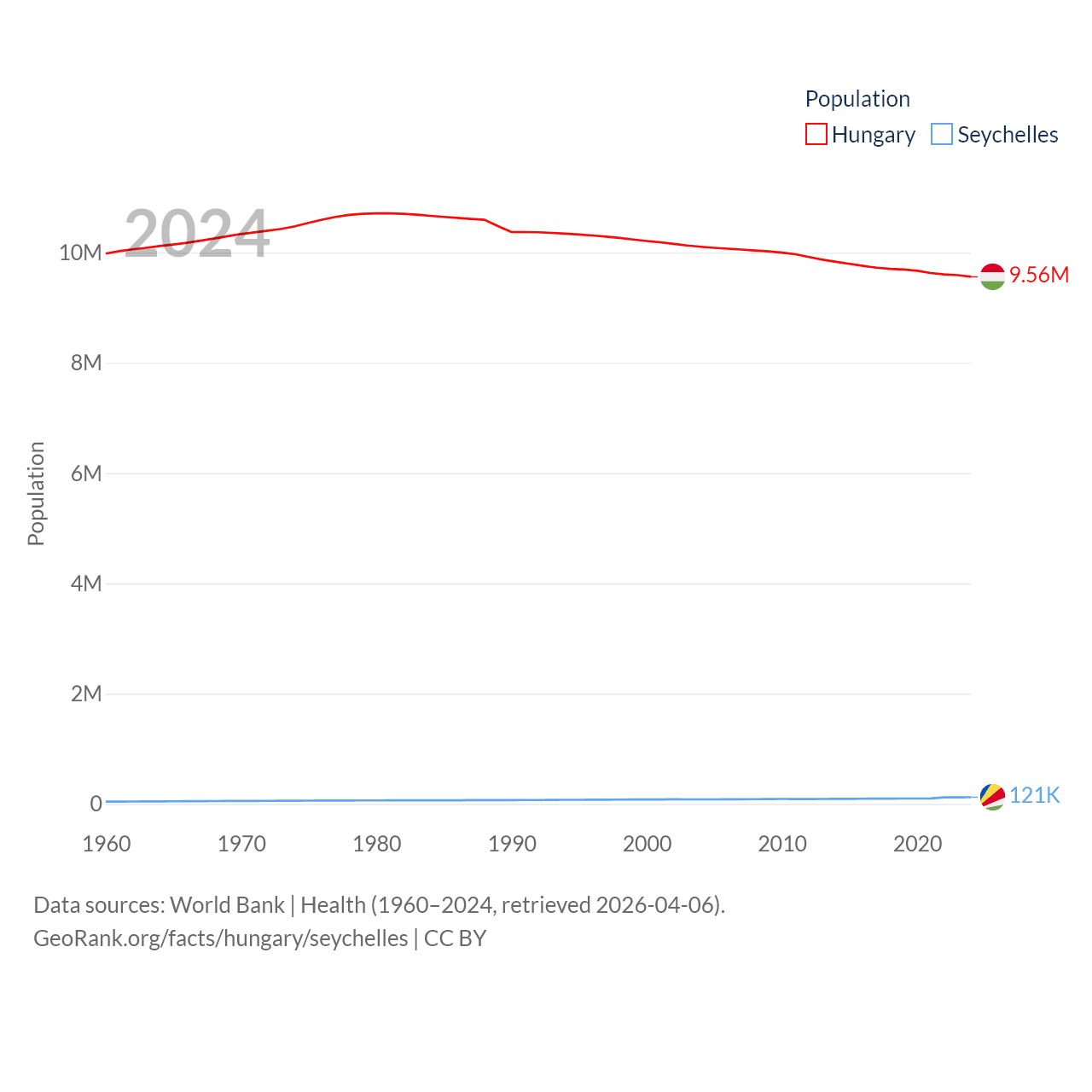 Hungary has a population of 9.56M (ranked 97/197), compared with 121K in The Seychelles (ranked 181/197). Hungary's land area is 35,236 sq mi versus 177.6 sq mi for The Seychelles (ranked 109th vs. 181st).
