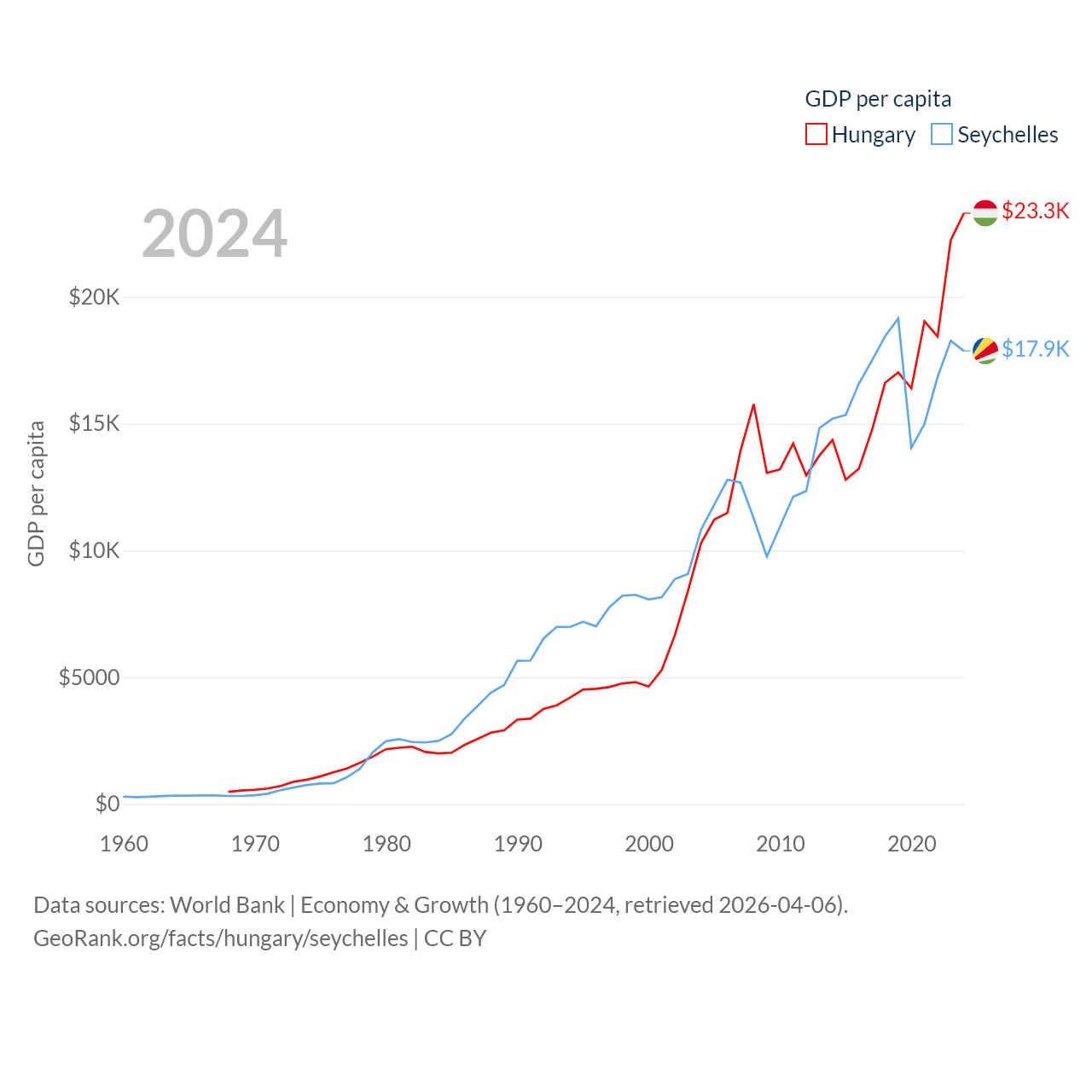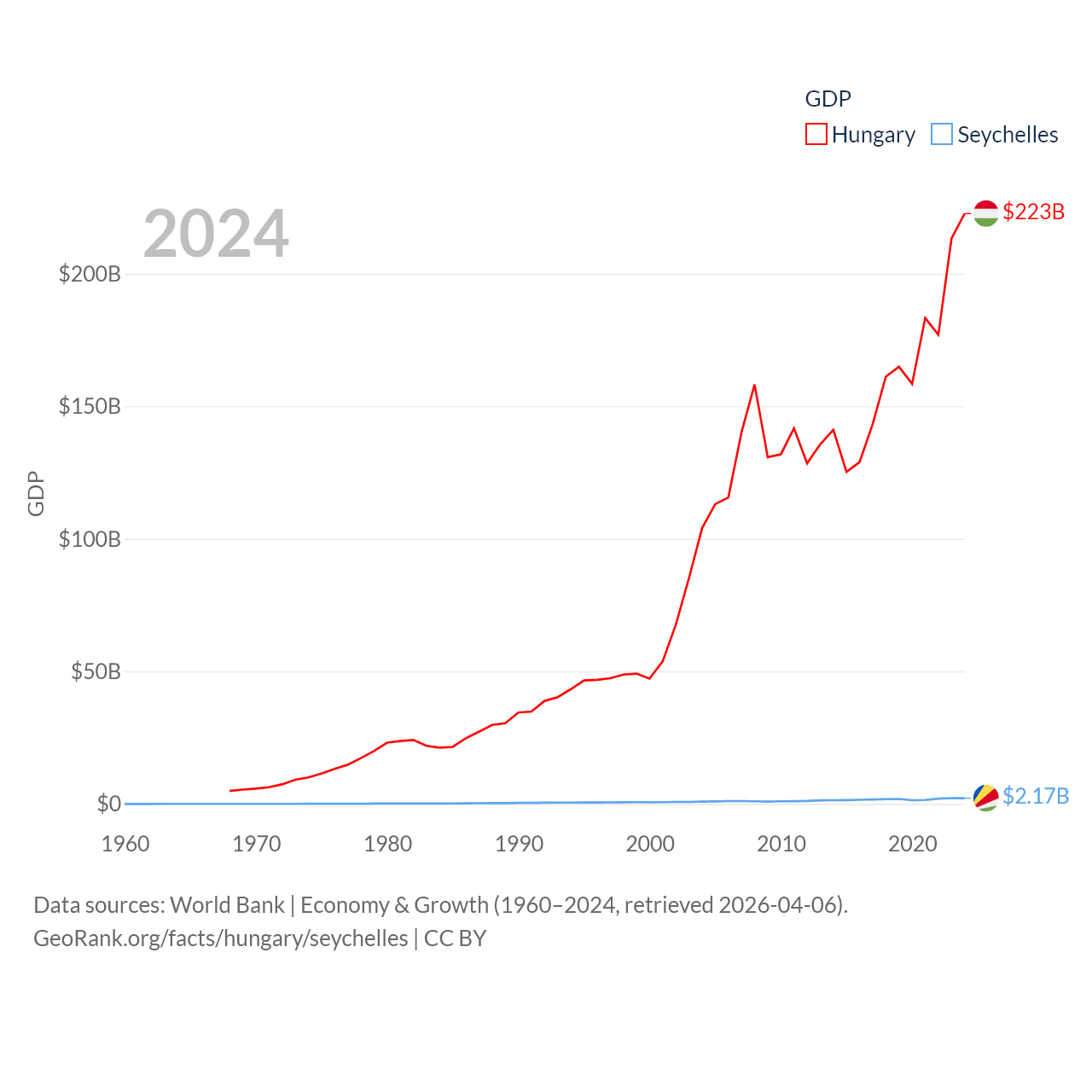 By GDP, Hungary ranks 55/197 ($223B) and The Seychelles ranks 178/197 ($2.17B). By GDP per capita, Hungary ranks 55/197 ($23,292), while The Seychelles ranks 63/197 ($17,859).