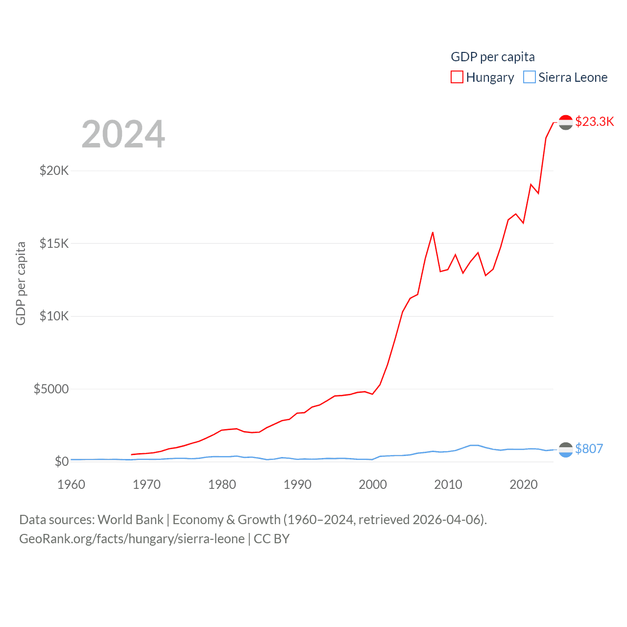 By GDP, Hungary ranks 55/197 ($223B) and Sierra Leone ranks 160/197 ($6.97B). By GDP per capita, Hungary ranks 55/197 ($23,292), while Sierra Leone ranks 186/197 ($807).