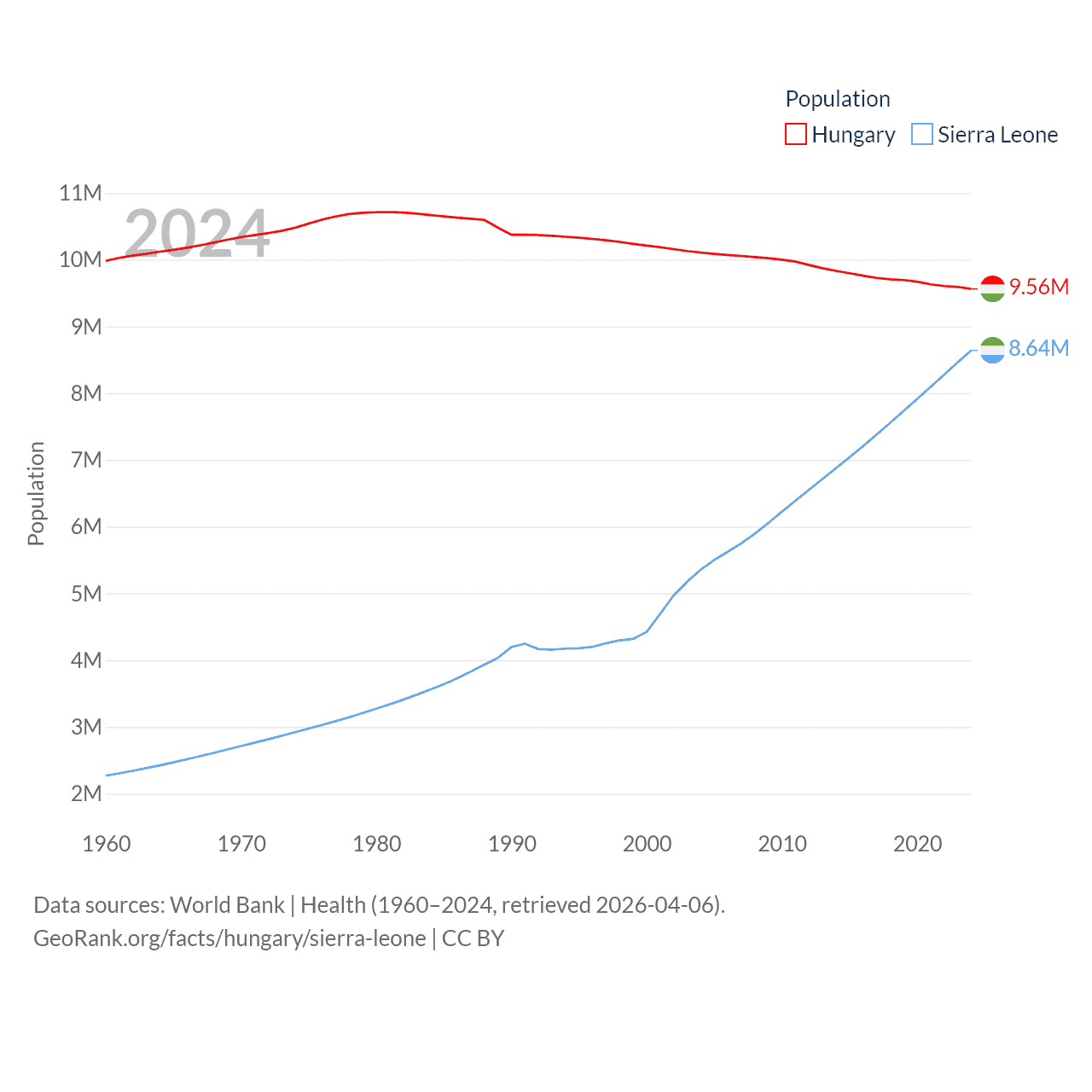 Hungary has a population of 9.56M (ranked 97/197), compared with 8.64M in Sierra Leone (ranked 102/197). Hungary's land area is 35,236 sq mi versus 27,869 sq mi for Sierra Leone (ranked 109th vs. 116th).