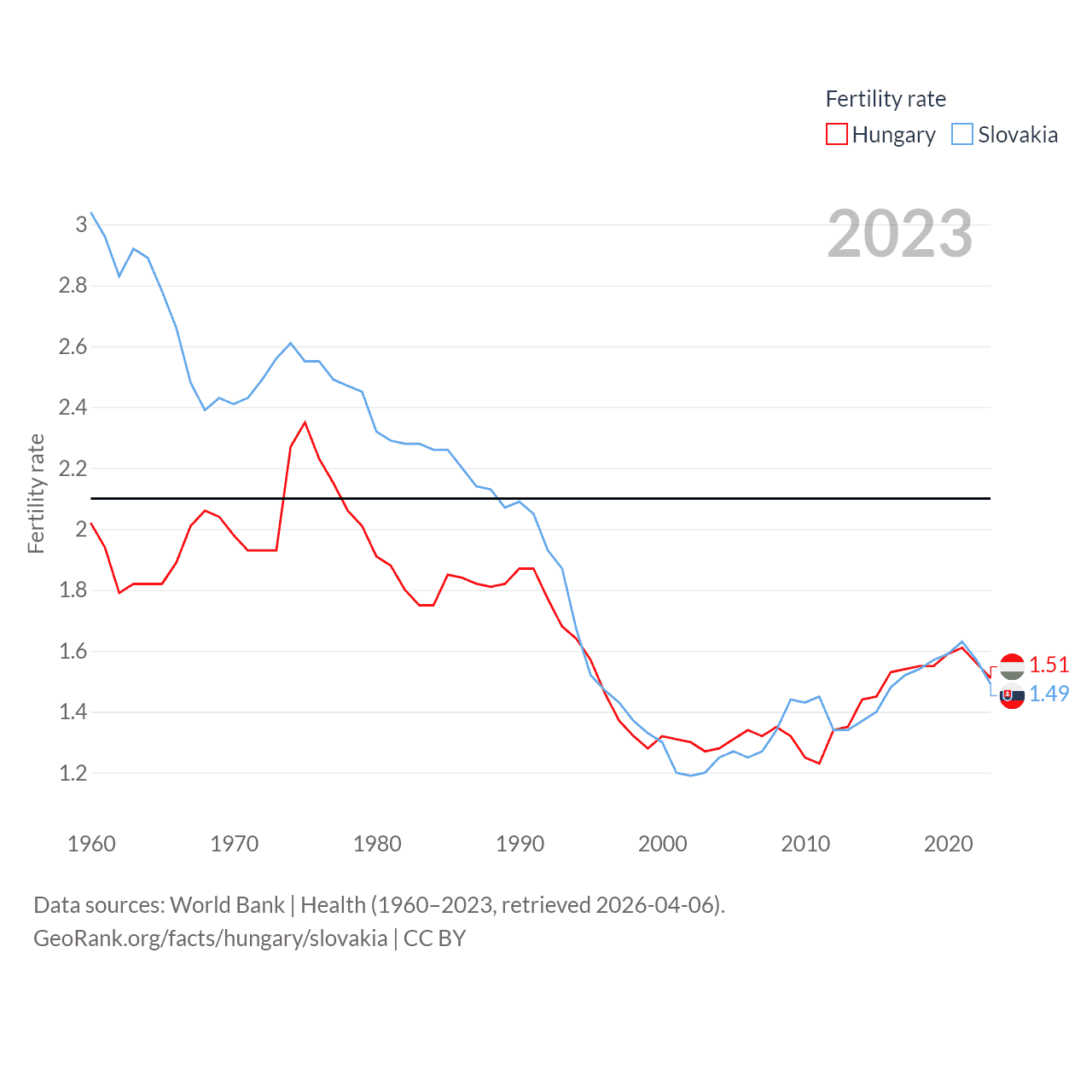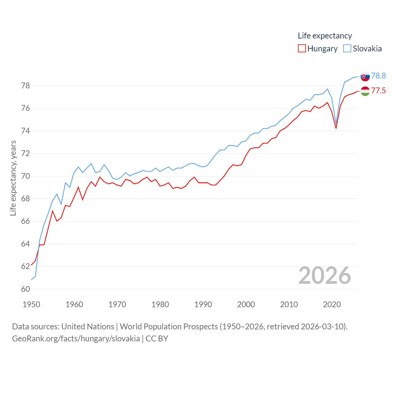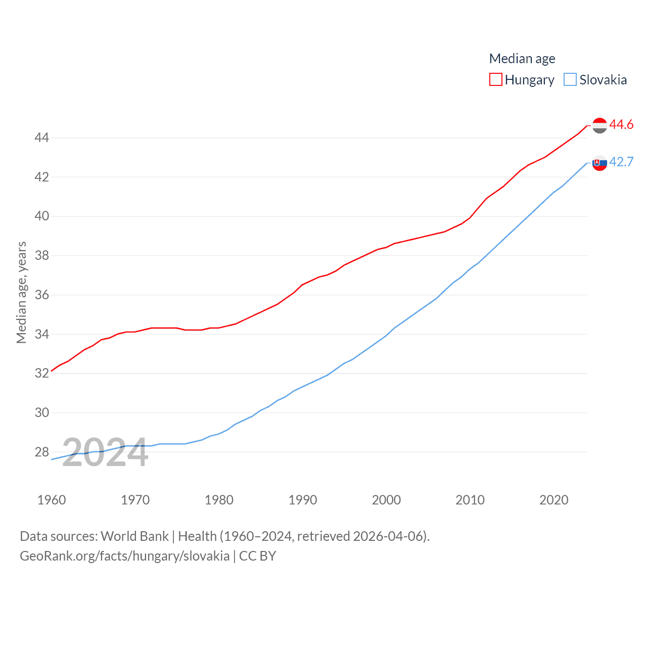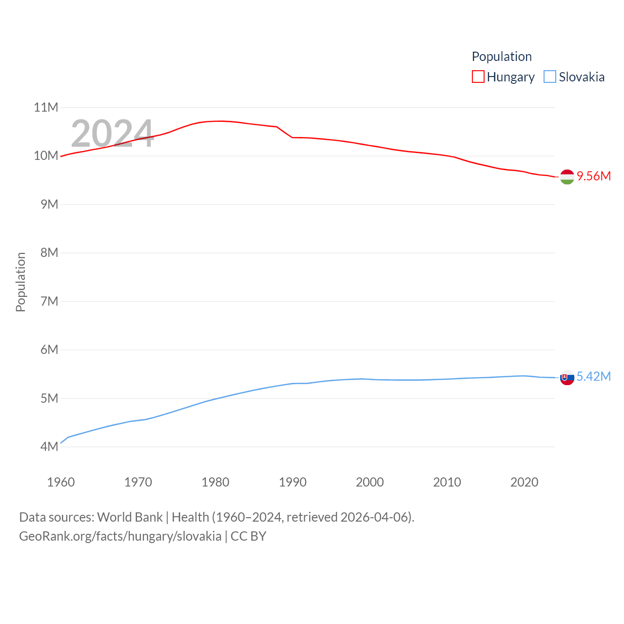 Hungary has a population of 9.56M (ranked 97/197), compared with 5.42M in Slovakia (ranked 119/197). Hungary's land area is 35,236 sq mi versus 18,564 sq mi for Slovakia (ranked 109th vs. 128th).