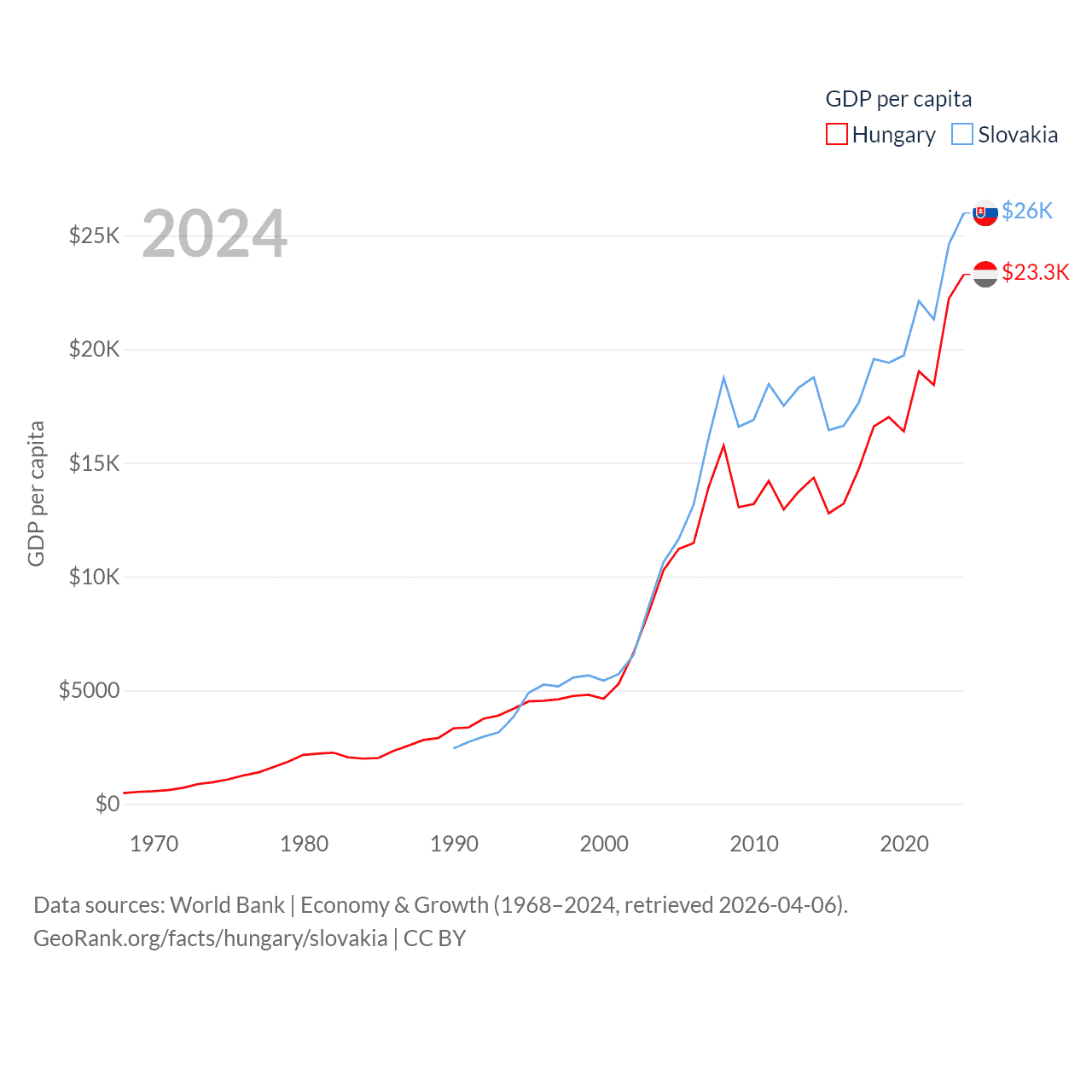 By GDP, Hungary ranks 55/197 ($223B) and Slovakia ranks 61/197 ($141B). By GDP per capita, Hungary ranks 55/197 ($23,292), while Slovakia ranks 47/197 ($25,993).