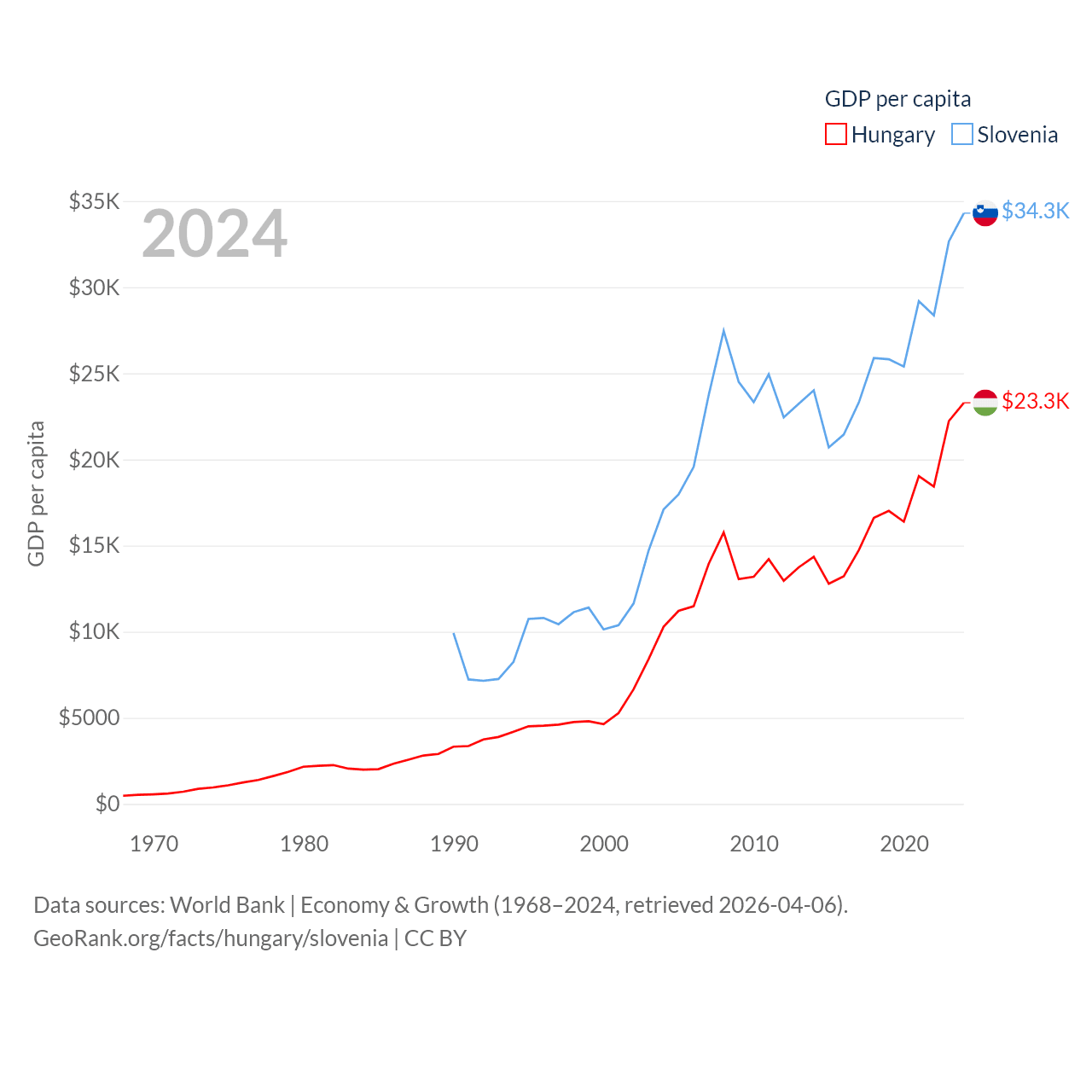 By GDP, Hungary ranks 55/197 ($223B) and Slovenia ranks 86/197 ($73B). By GDP per capita, Hungary ranks 55/197 ($23,292), while Slovenia ranks 34/197 ($34,301).