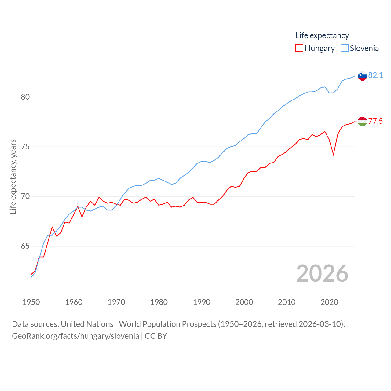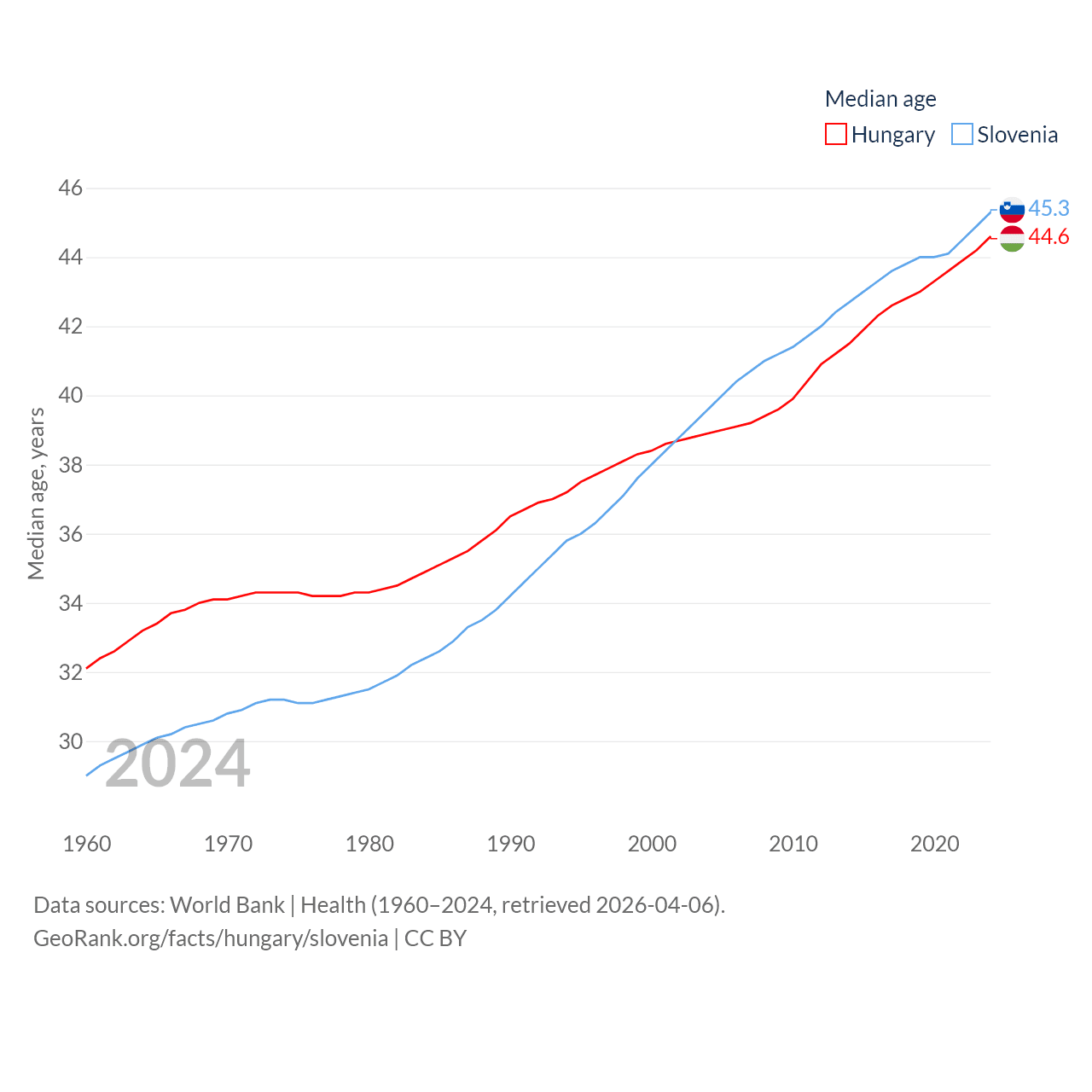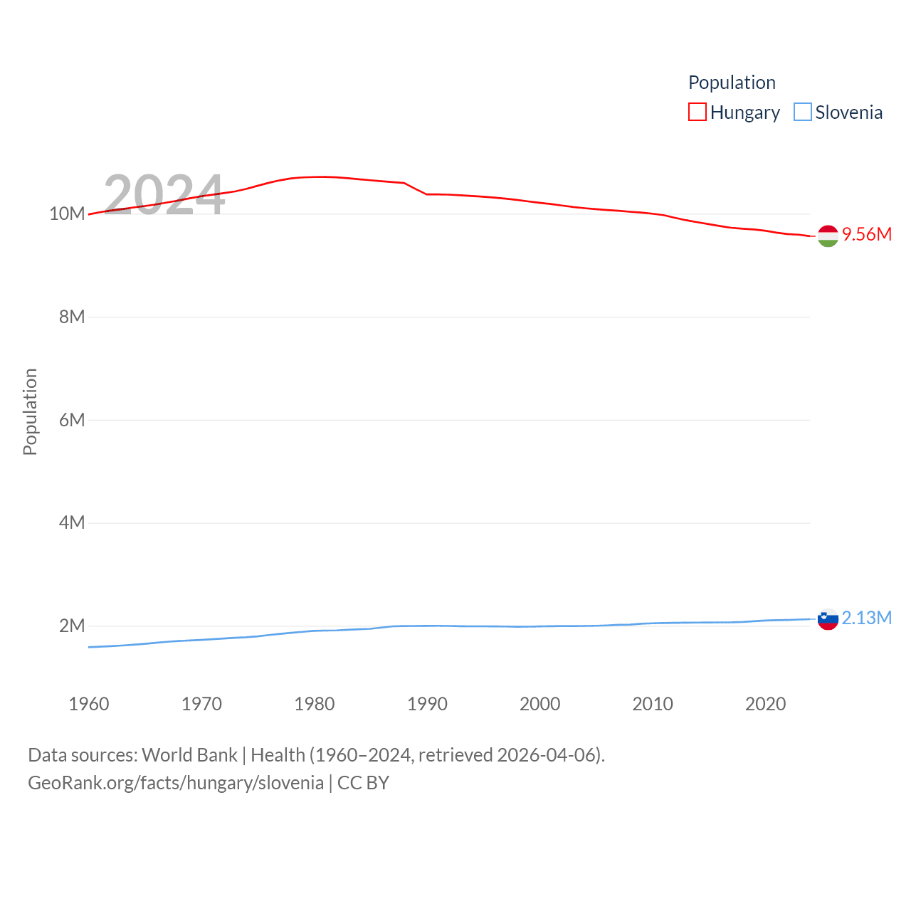 Hungary has a population of 9.56M (ranked 97/197), compared with 2.13M in Slovenia (ranked 147/197). Hungary's land area is 35,236 sq mi versus 7,774 sq mi for Slovenia (ranked 109th vs. 151st).