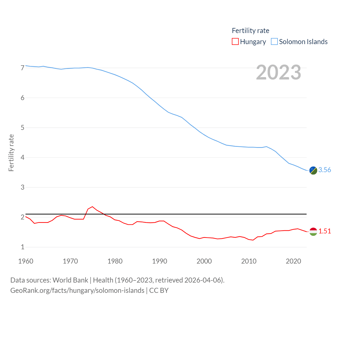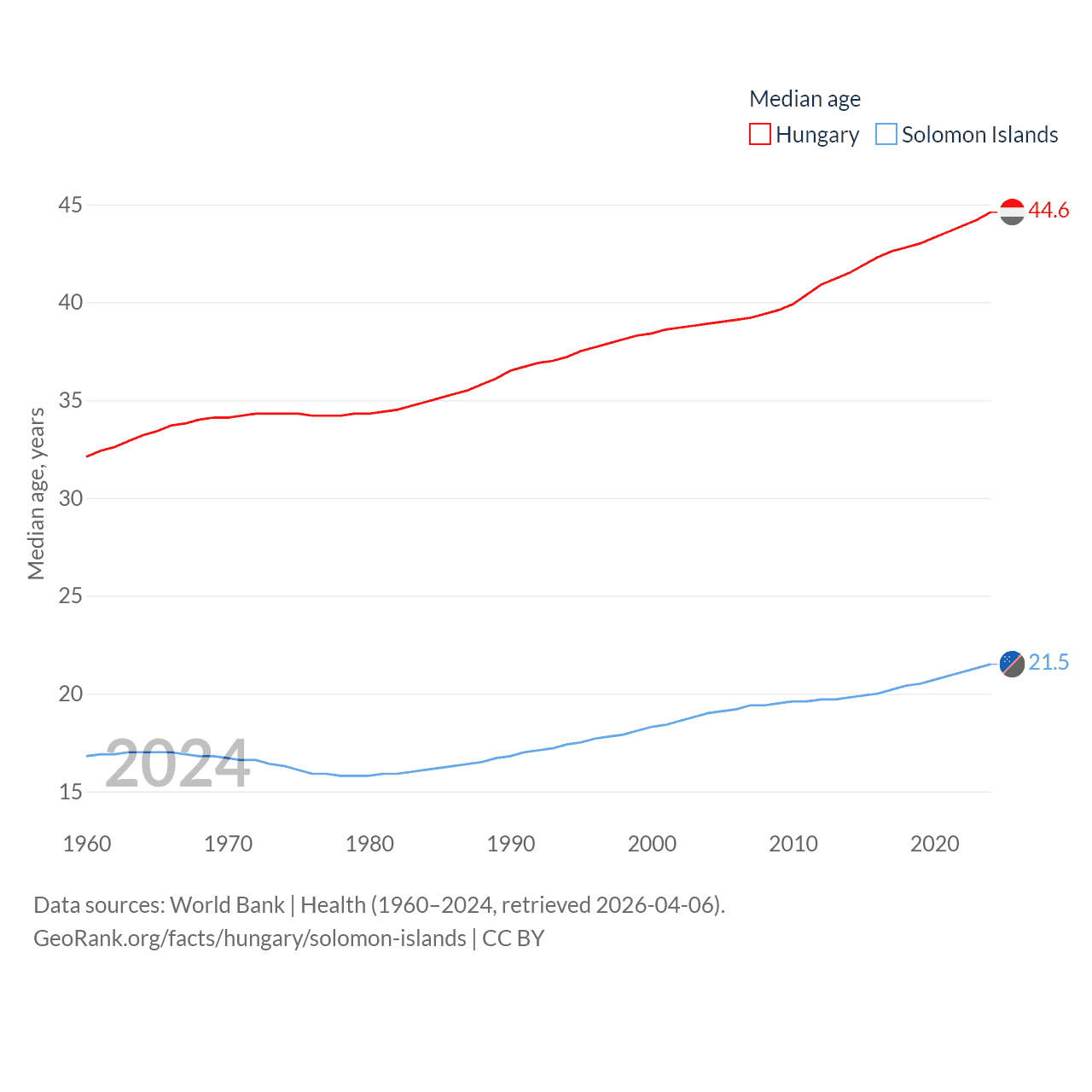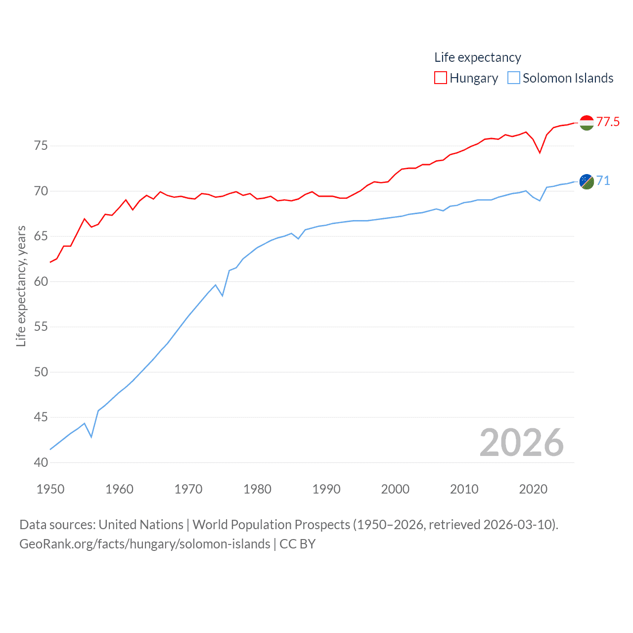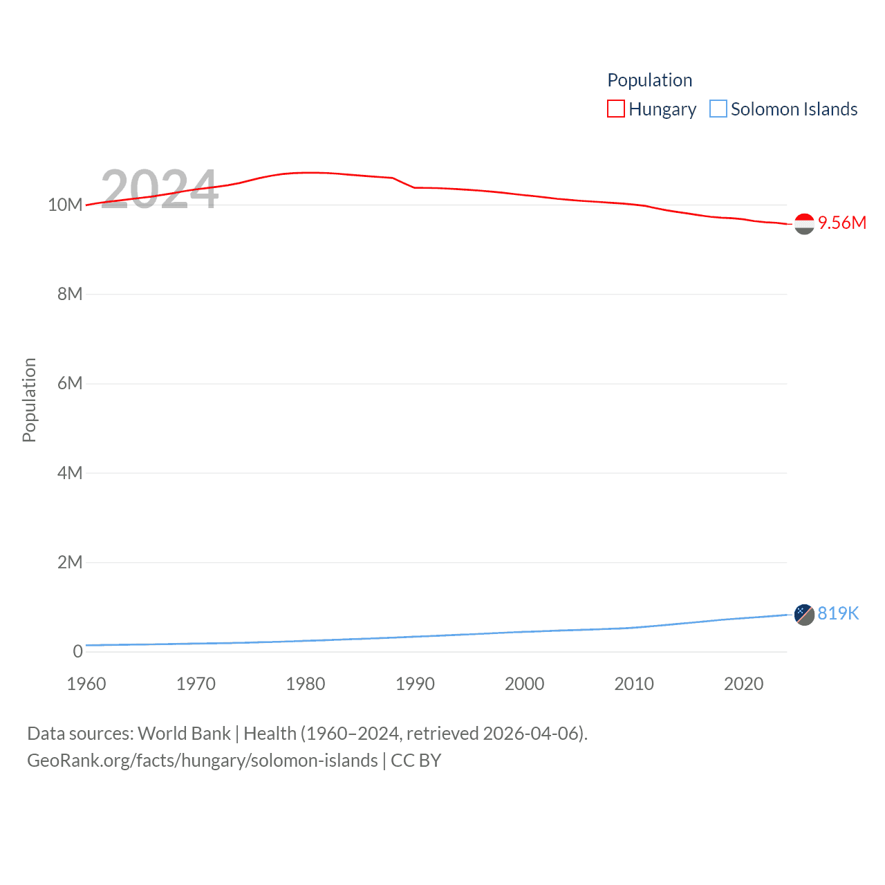 Hungary has a population of 9.56M (ranked 97/197), compared with 819K in The Solomon Islands (ranked 162/197). Hungary's land area is 35,236 sq mi versus 10,807 sq mi for The Solomon Islands (ranked 109th vs. 141st).