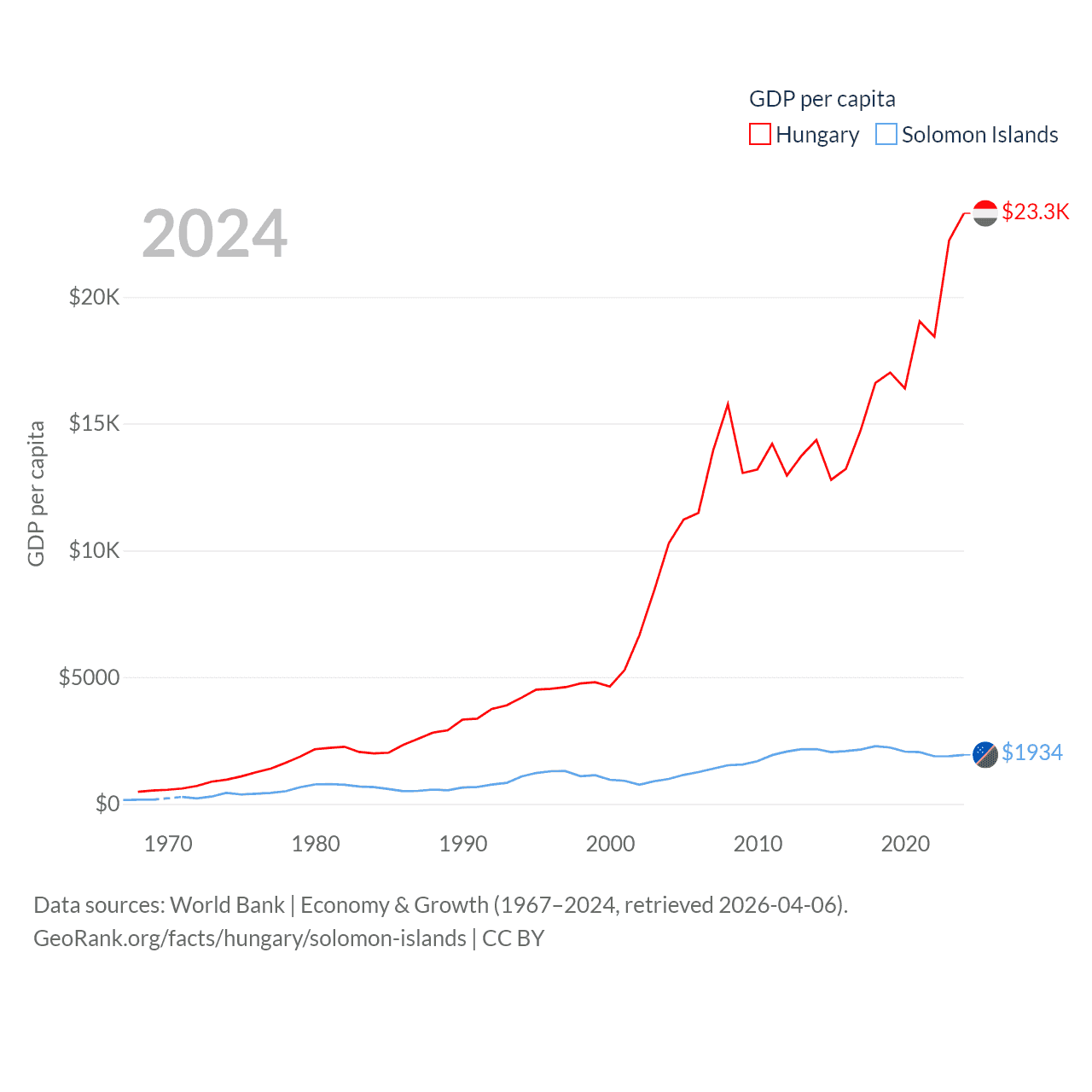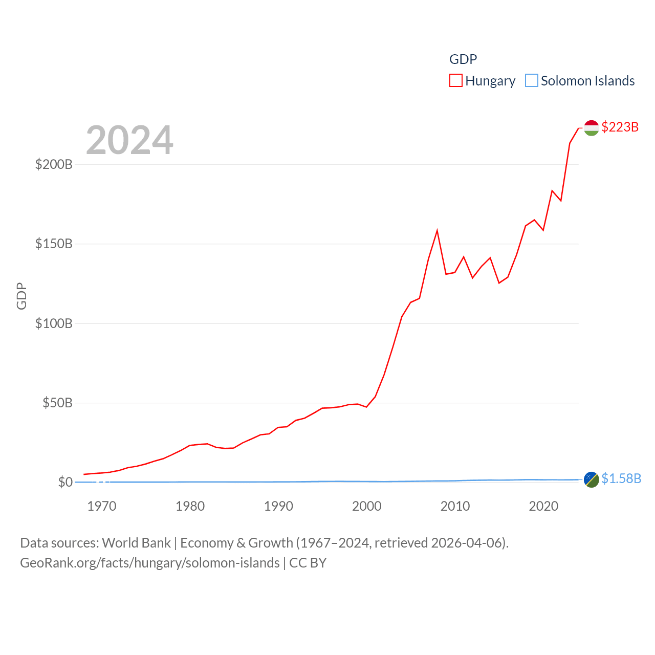 By GDP, Hungary ranks 55/197 ($223B) and The Solomon Islands ranks 182/197 ($1.58B). By GDP per capita, Hungary ranks 55/197 ($23,292), while The Solomon Islands ranks 157/197 ($1,934).