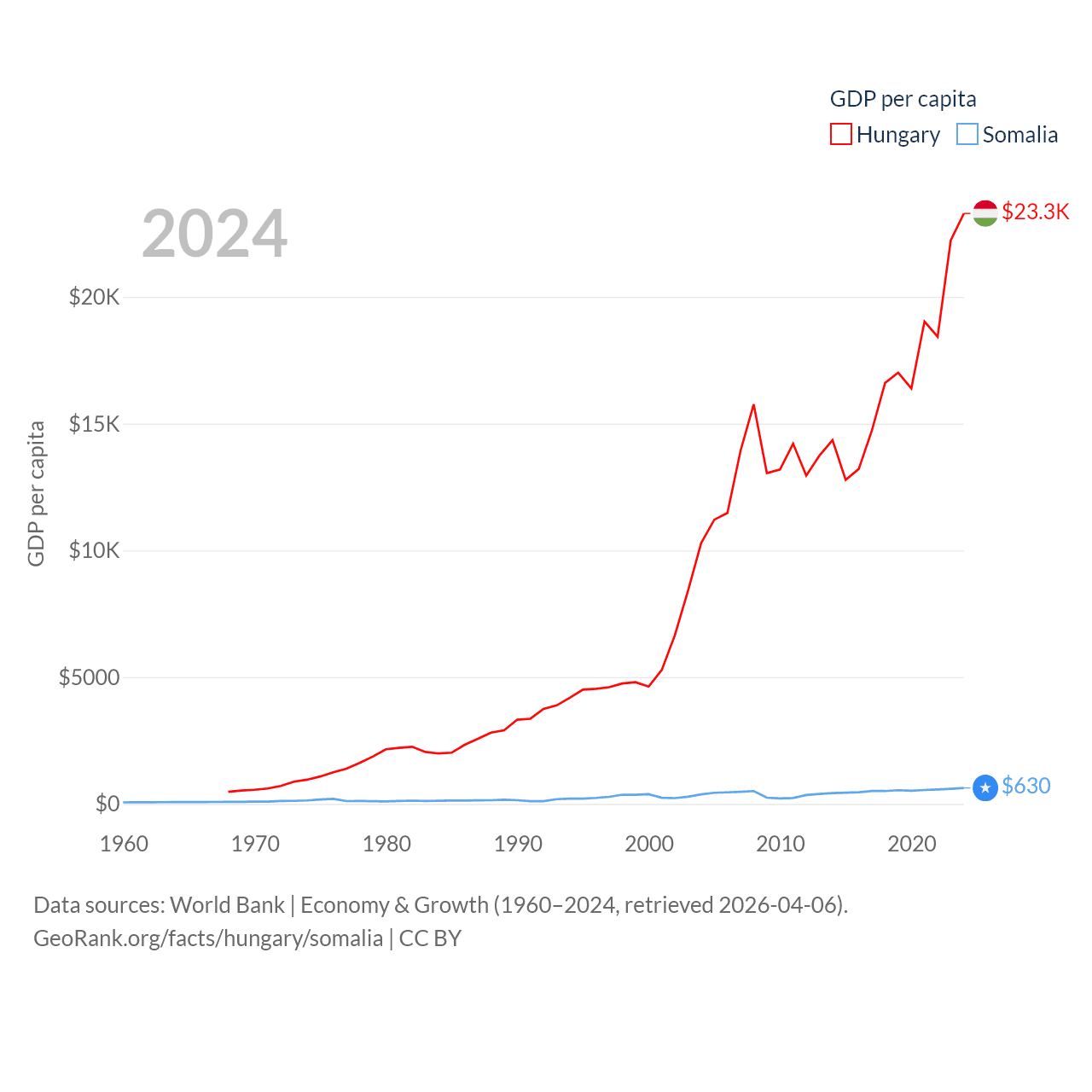 By GDP, Hungary ranks 55/197 ($223B) and Somalia ranks 150/197 ($12B). By GDP per capita, Hungary ranks 55/197 ($23,292), while Somalia ranks 192/197 ($630).