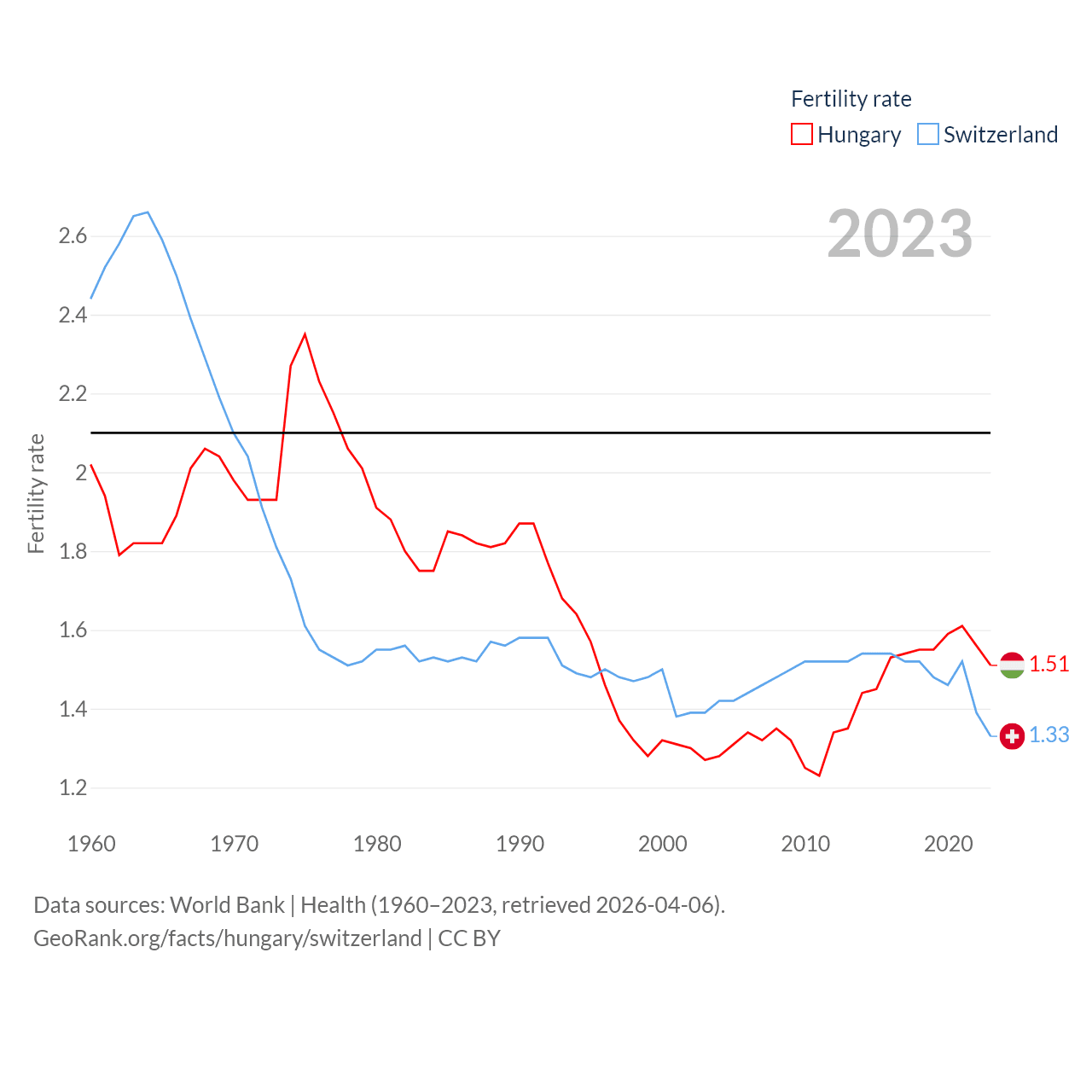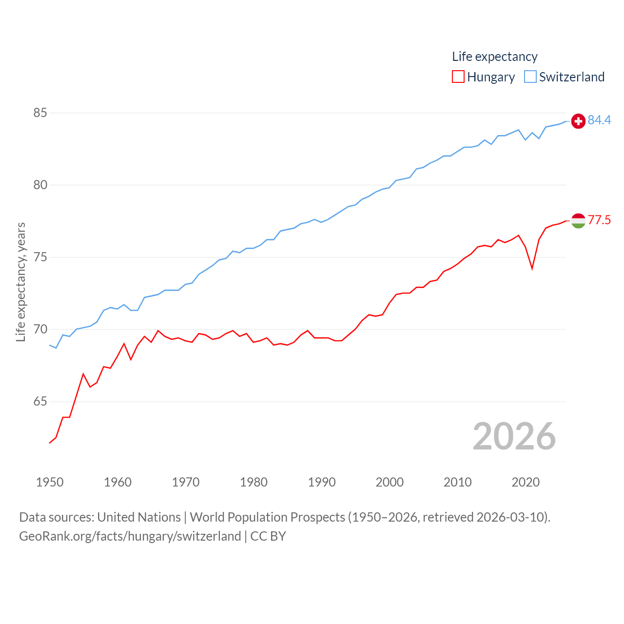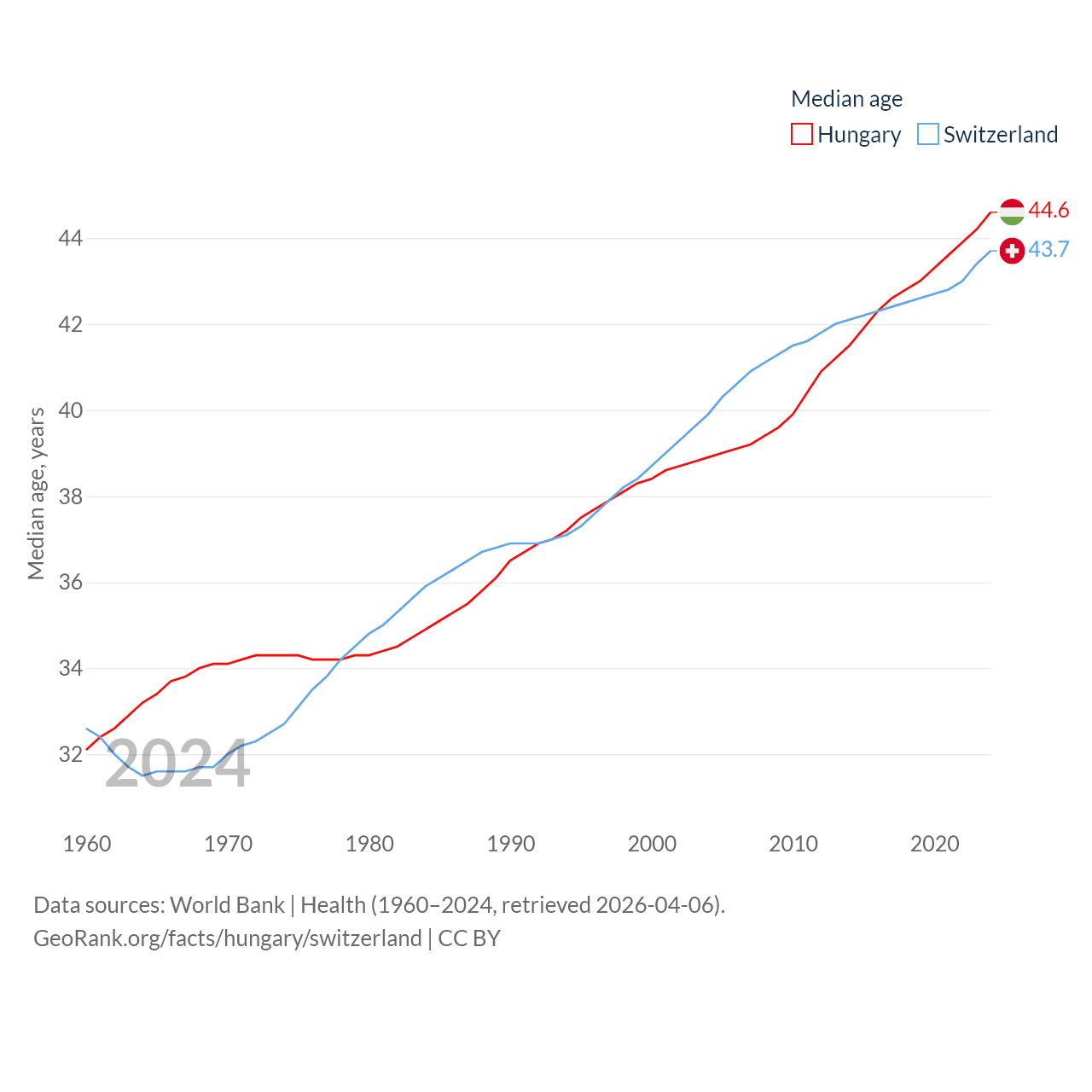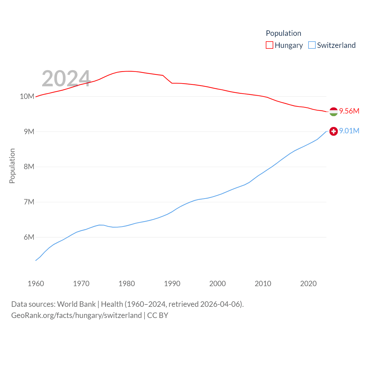 Hungary has a population of 9.56M (ranked 97/197), compared with 9.01M in Switzerland (ranked 101/197). Hungary's land area is 35,236 sq mi versus 15,255 sq mi for Switzerland (ranked 109th vs. 131st).