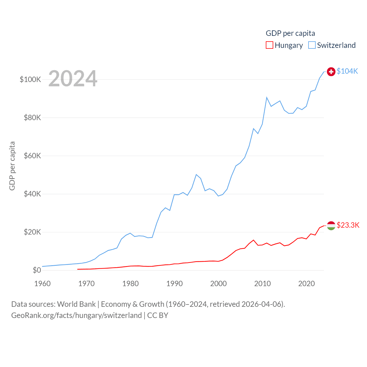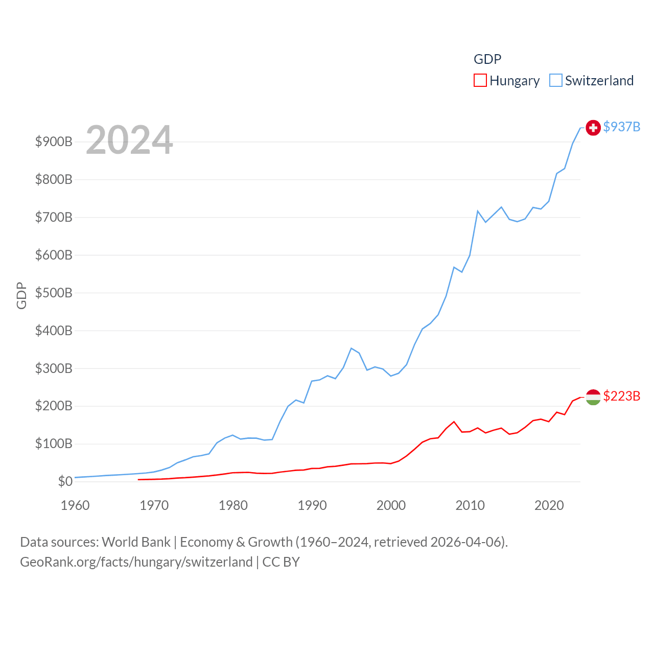 By GDP, Hungary ranks 55/197 ($223B) and Switzerland ranks 20/197 ($937B). By GDP per capita, Hungary ranks 55/197 ($23,292), while Switzerland ranks 5/197 ($103,998).