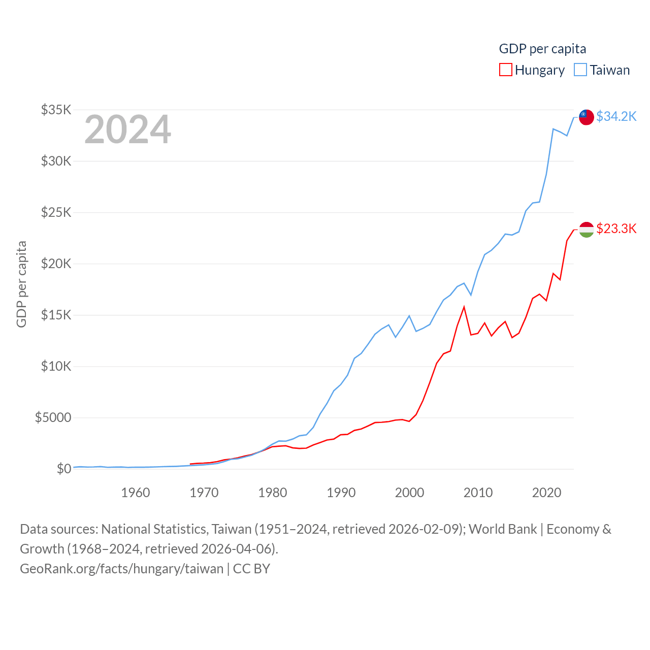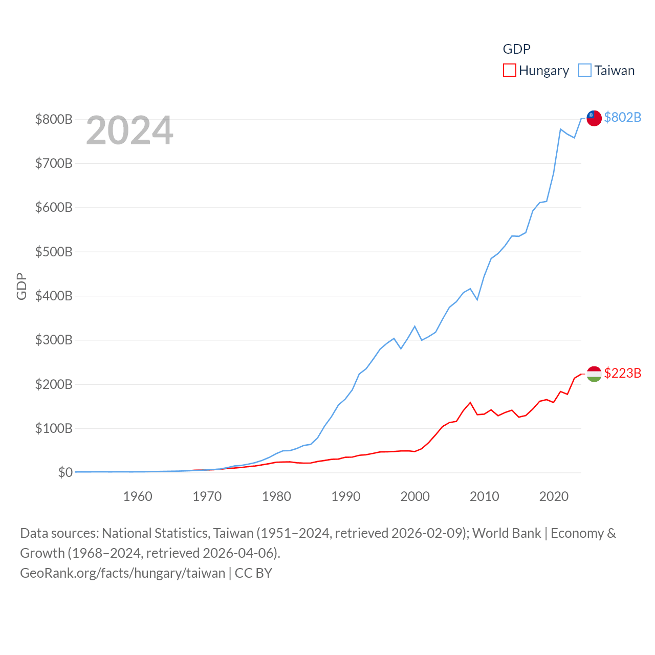 By GDP, Hungary ranks 55/197 ($223B) and Taiwan ranks 22/197 ($802B). By GDP per capita, Hungary ranks 55/197 ($23,292), while Taiwan ranks 35/197 ($34,238).