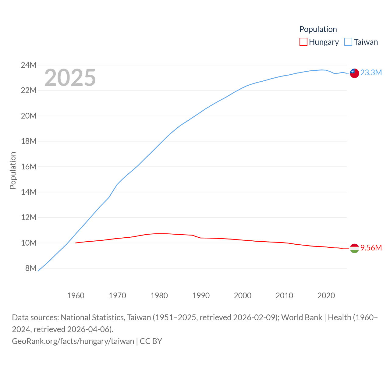Hungary has a population of 9.56M (ranked 97/197), compared with 23.3M in Taiwan (ranked 60/197). Hungary's land area is 35,236 sq mi versus 13,976 sq mi for Taiwan (ranked 109th vs. 133rd).