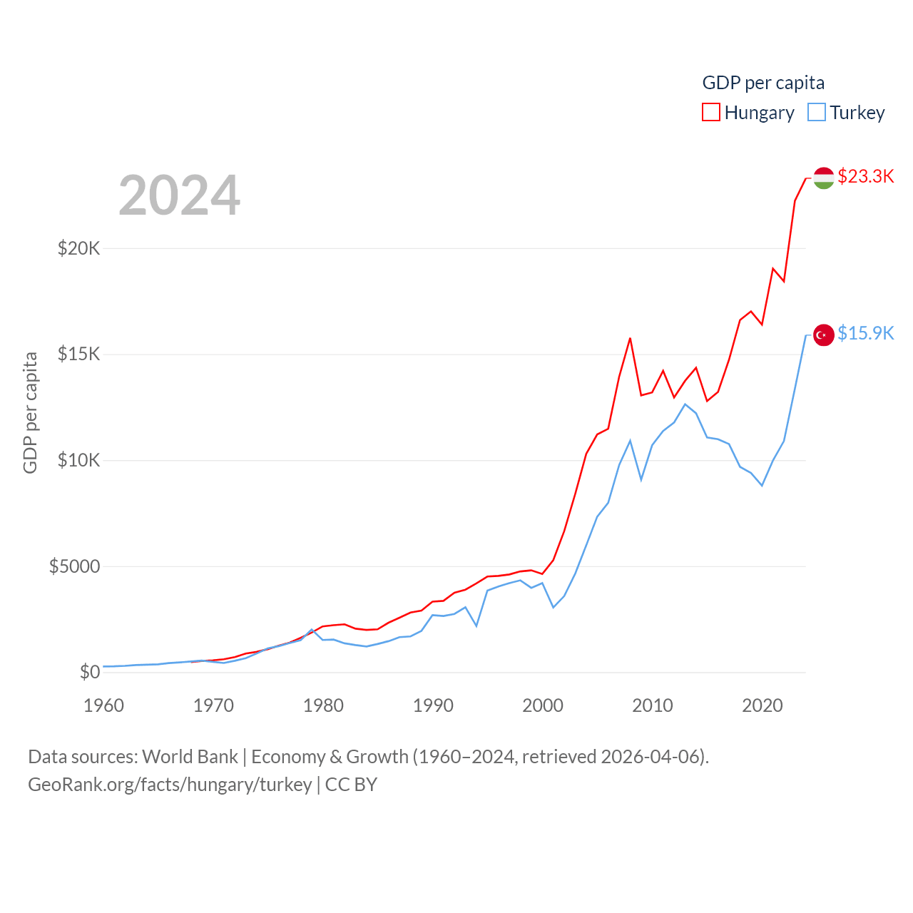 By GDP, Hungary ranks 55/197 ($223B) and Turkey ranks 17/197 ($1.36T). By GDP per capita, Hungary ranks 55/197 ($23,292), while Turkey ranks 66/197 ($15,893).