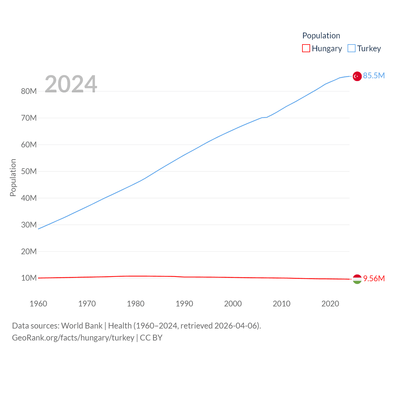Hungary has a population of 9.56M (ranked 97/197), compared with 85.5M in Turkey (ranked 18/197). Hungary's land area is 35,236 sq mi versus 297,156 sq mi for Turkey (ranked 109th vs. 36th).