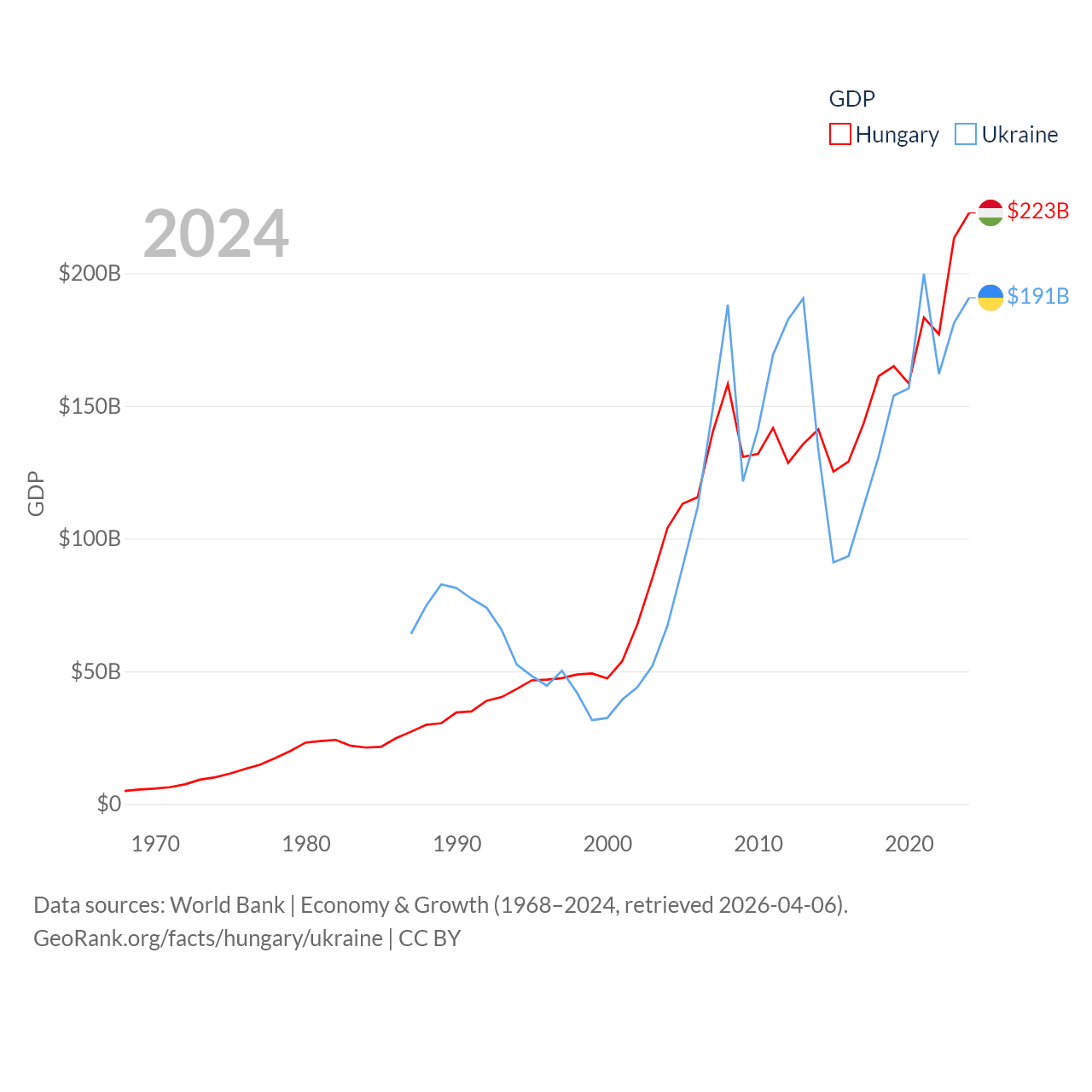 By GDP, Hungary ranks 55/197 ($223B) and Ukraine ranks 57/197 ($191B). By GDP per capita, Hungary ranks 55/197 ($23,292), while Ukraine ranks 120/197 ($5,038).