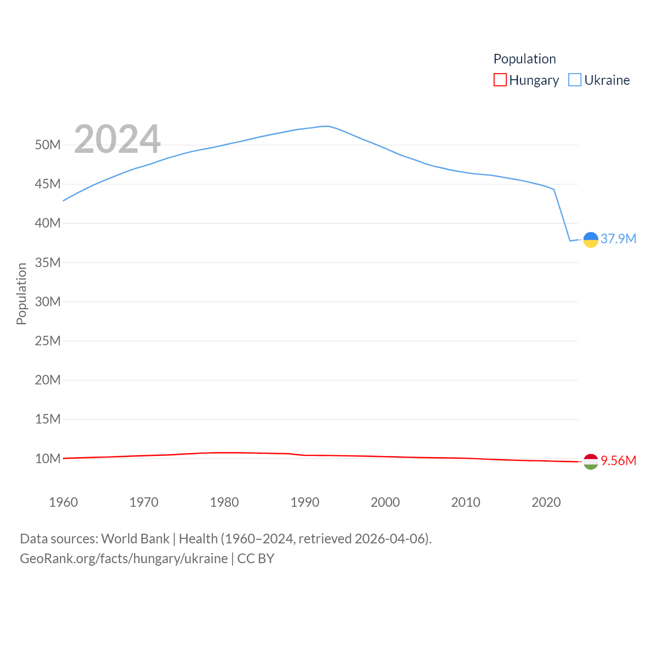 Hungary has a population of 9.56M (ranked 97/197), compared with 37.9M in Ukraine (ranked 41/197). Hungary's land area is 35,236 sq mi versus 223,708 sq mi for Ukraine (ranked 109th vs. 46th).