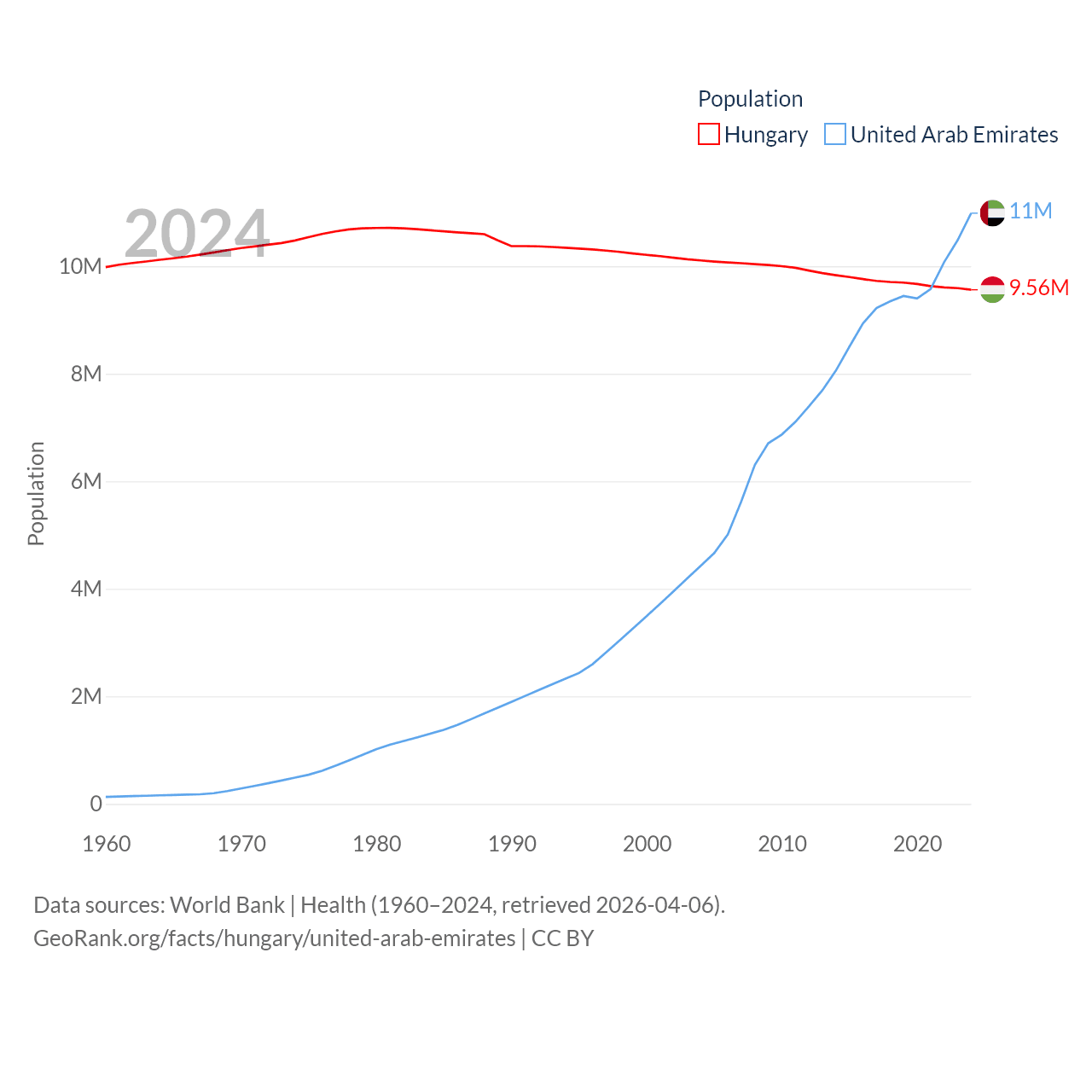 Hungary has a population of 9.56M (ranked 97/197), compared with 11M in The United Arab Emirates (ranked 86/197). Hungary's land area is 35,236 sq mi versus 27,421 sq mi for The United Arab Emirates (ranked 109th vs. 117th).