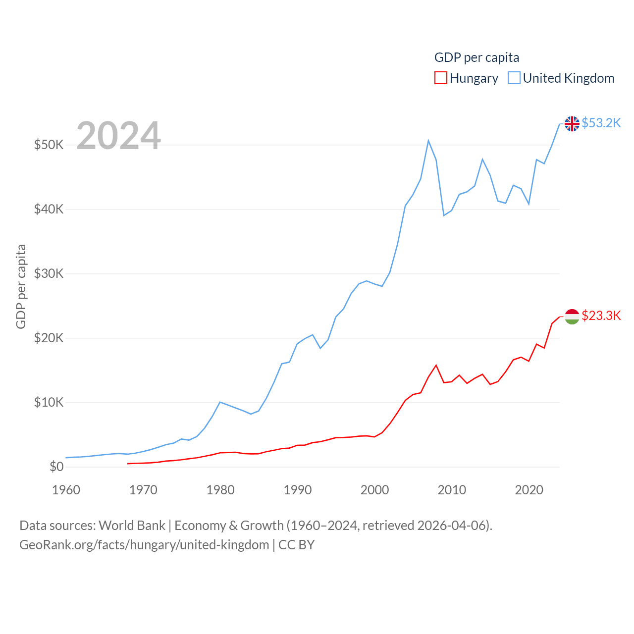 By GDP, Hungary ranks 55/197 ($223B) and The United Kingdom ranks 6/197 ($3.69T). By GDP per capita, Hungary ranks 55/197 ($23,292), while The United Kingdom ranks 22/197 ($53,246).