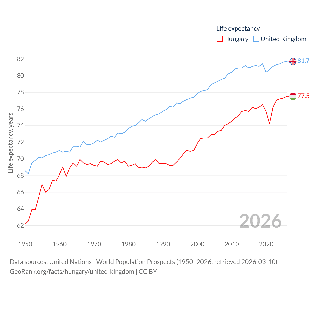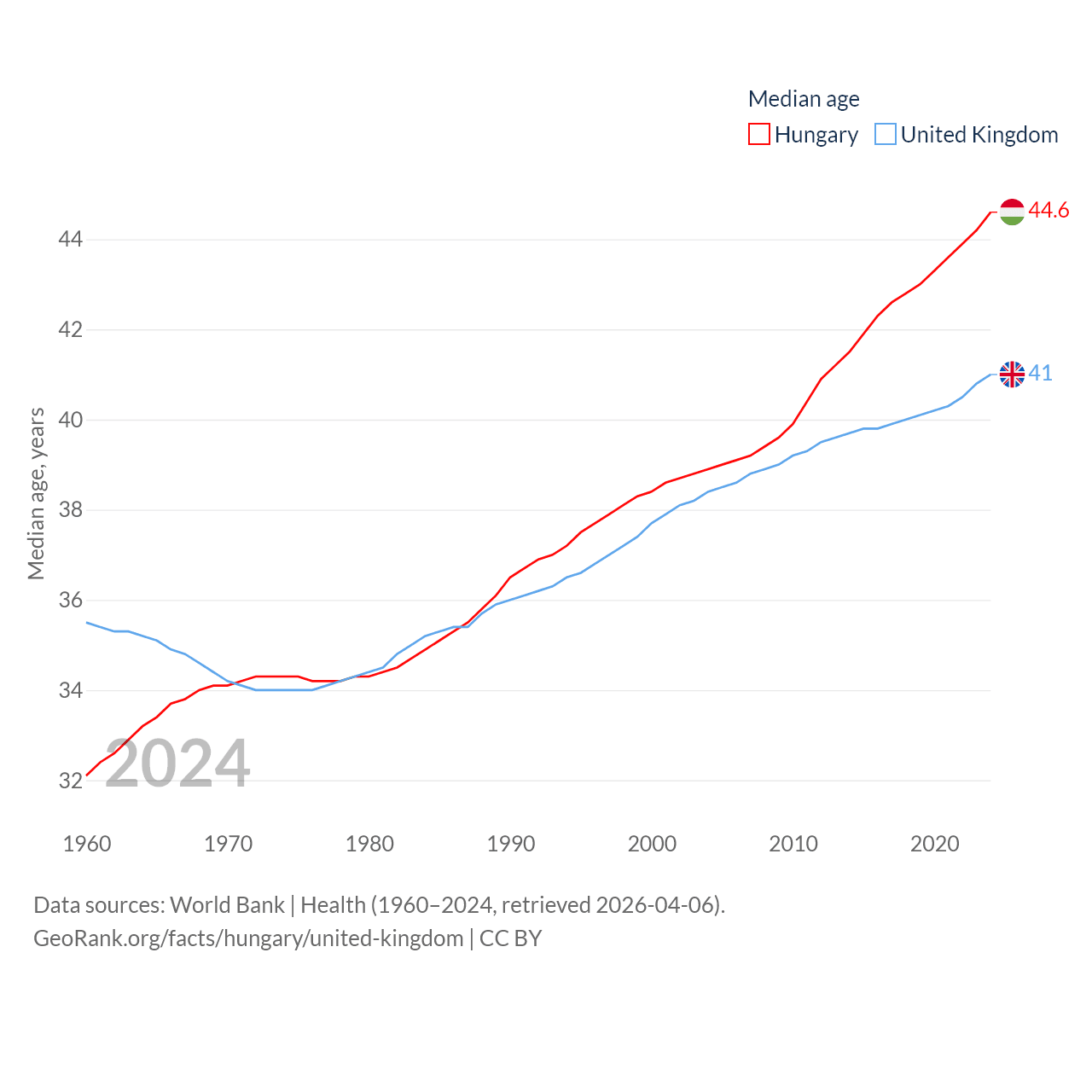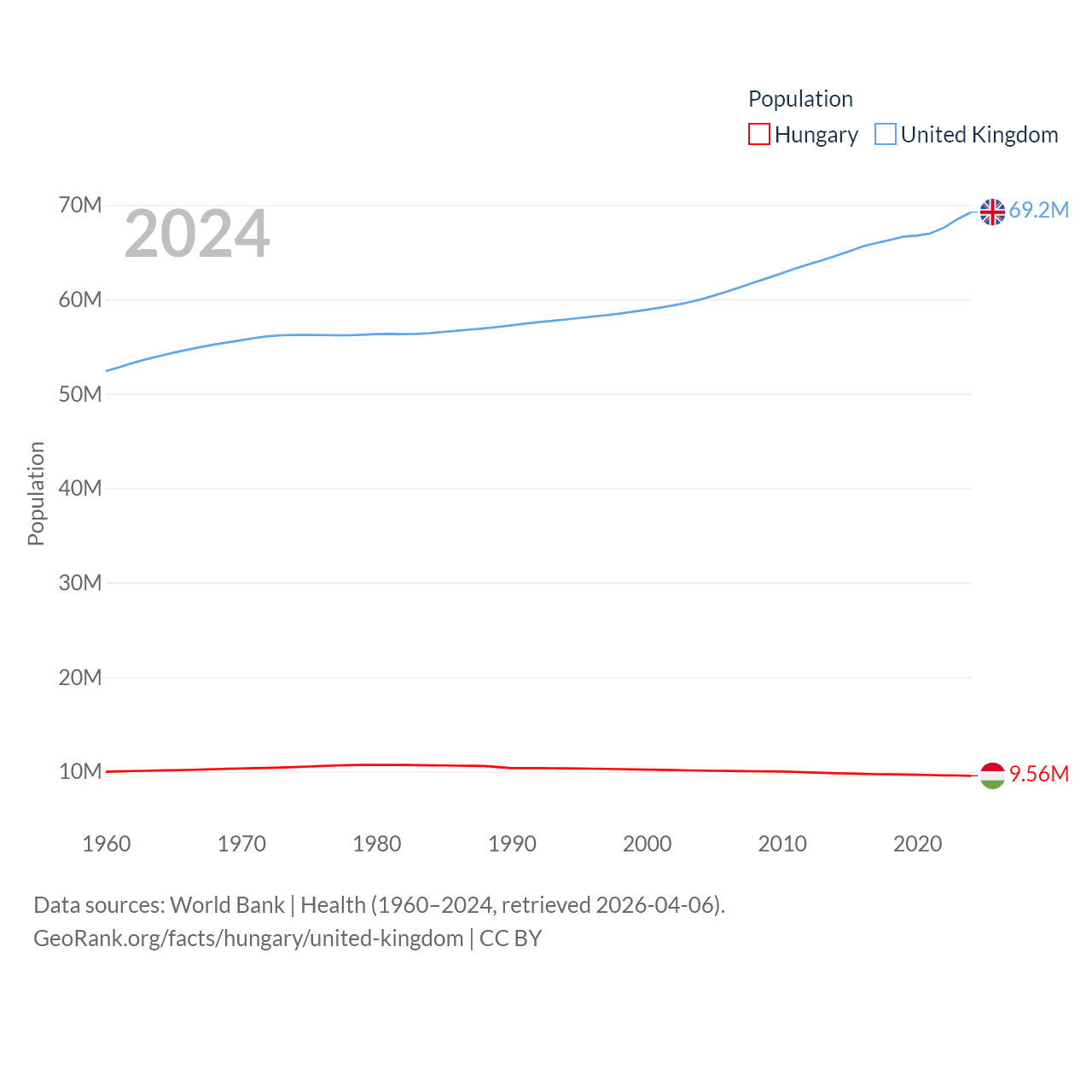 Hungary has a population of 9.56M (ranked 97/197), compared with 69.2M in The United Kingdom (ranked 21/197). Hungary's land area is 35,236 sq mi versus 93,410 sq mi for The United Kingdom (ranked 109th vs. 78th).