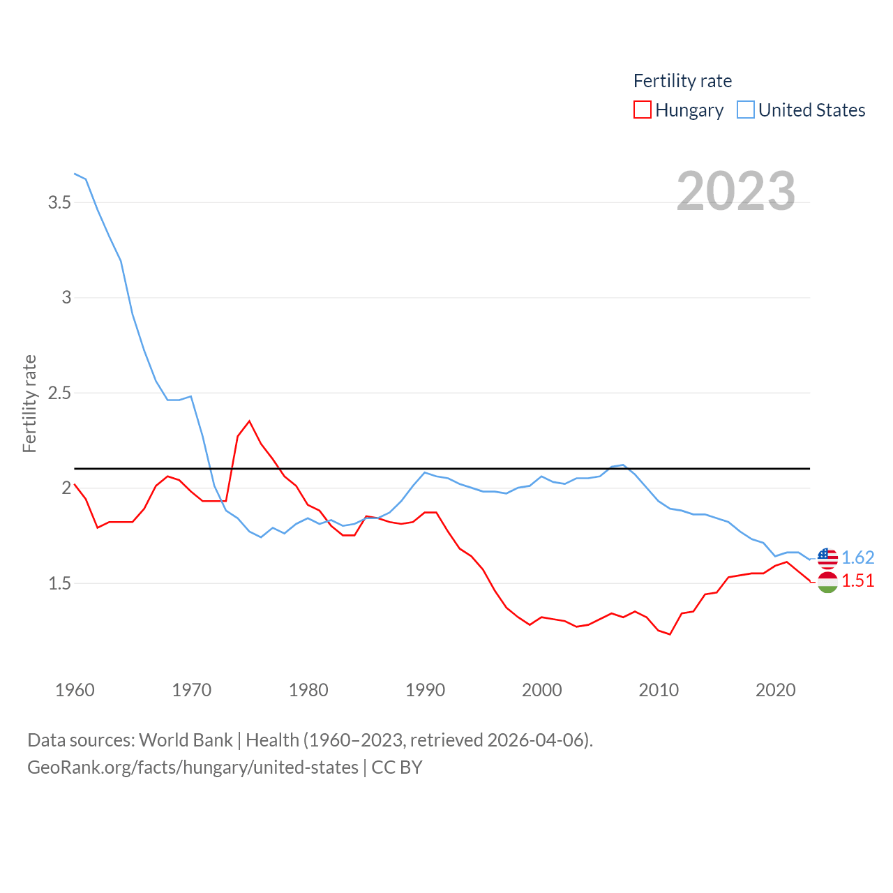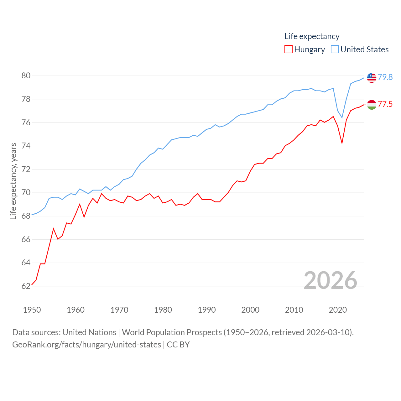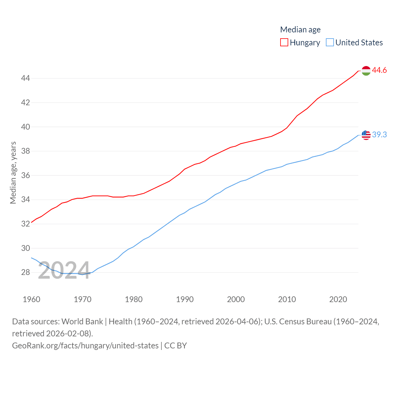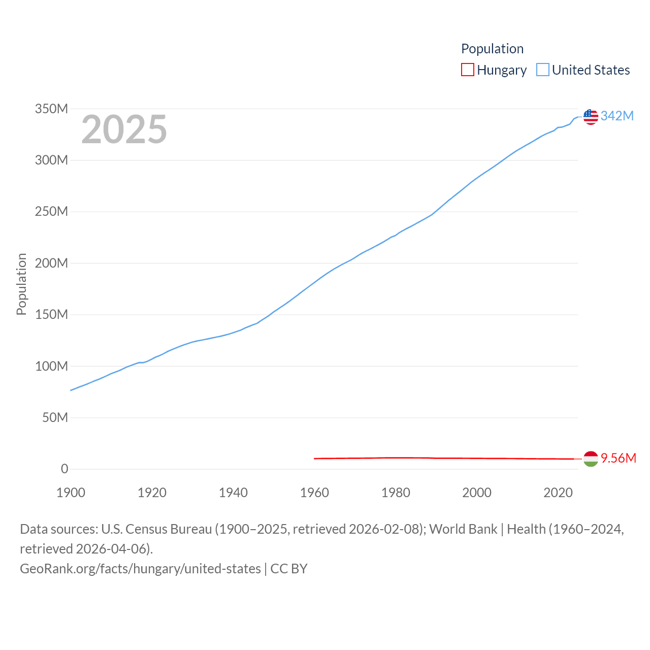 Hungary has a population of 9.56M (ranked 97/197), compared with 342M in The United States (ranked 3/197). Hungary's land area is 35,236 sq mi versus 3,531,839 sq mi for The United States (ranked 109th vs. 3rd).