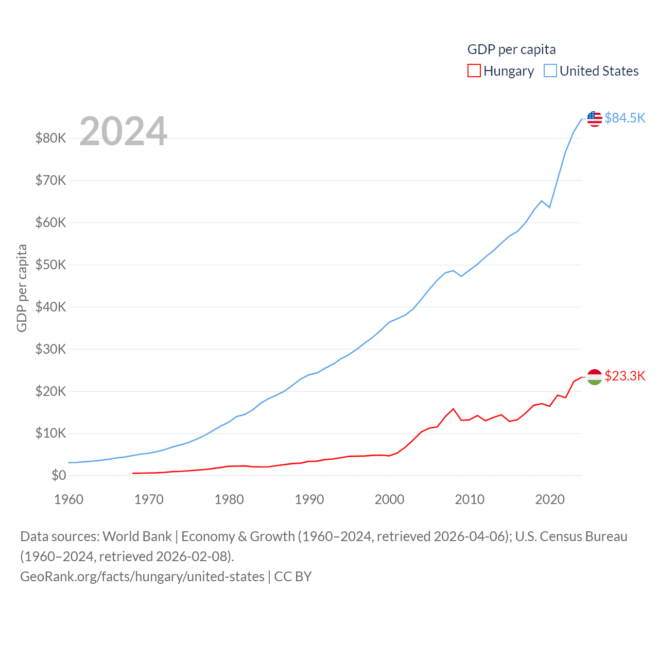By GDP, Hungary ranks 55/197 ($223B) and The United States ranks 1/197 ($28.8T). By GDP per capita, Hungary ranks 55/197 ($23,292), while The United States ranks 10/197 ($84,534).
