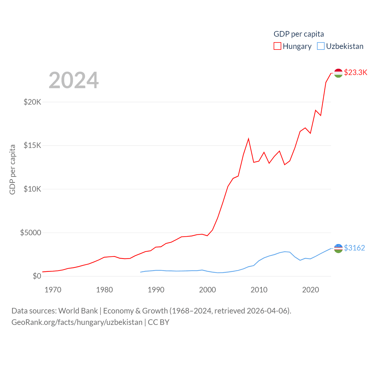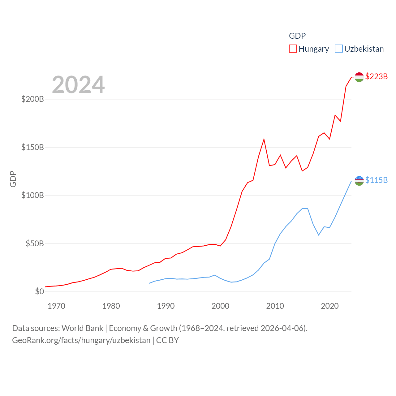 By GDP, Hungary ranks 55/197 ($223B) and Uzbekistan ranks 66/197 ($115B). By GDP per capita, Hungary ranks 55/197 ($23,292), while Uzbekistan ranks 139/197 ($3,162).