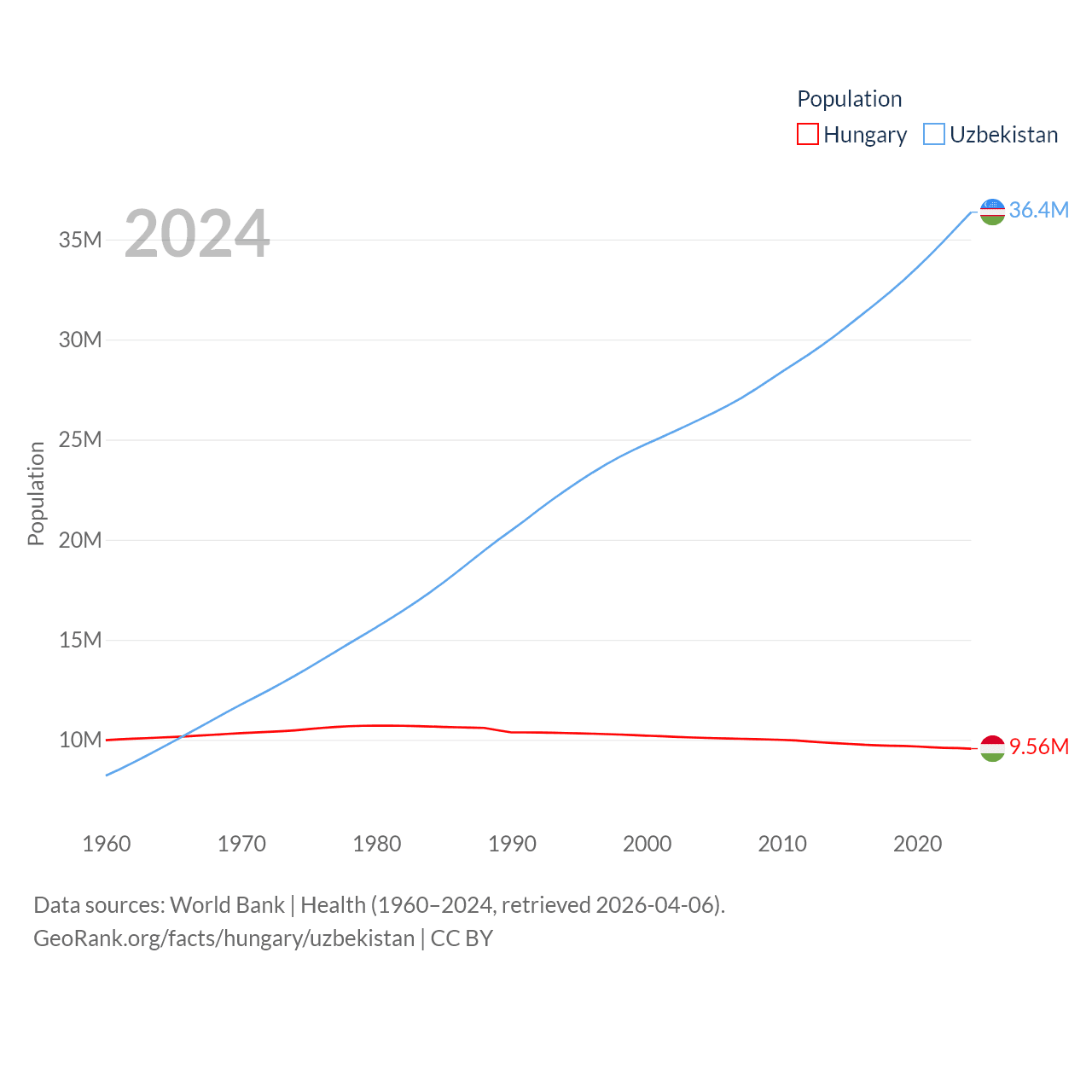 Hungary has a population of 9.56M (ranked 97/197), compared with 36.4M in Uzbekistan (ranked 43/197). Hungary's land area is 35,236 sq mi versus 170,136 sq mi for Uzbekistan (ranked 109th vs. 56th).