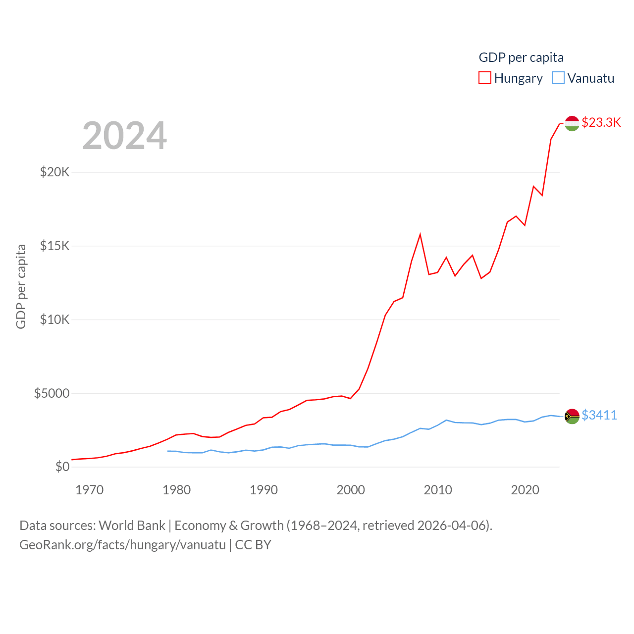 By GDP, Hungary ranks 55/197 ($223B) and Vanuatu ranks 188/197 ($1.12B). By GDP per capita, Hungary ranks 55/197 ($23,292), while Vanuatu ranks 137/197 ($3,411).