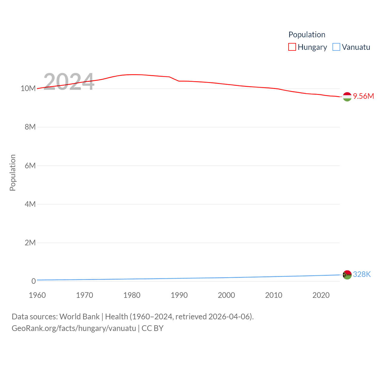 Hungary has a population of 9.56M (ranked 97/197), compared with 328K in Vanuatu (ranked 174/197). Hungary's land area is 35,236 sq mi versus 4,707 sq mi for Vanuatu (ranked 109th vs. 157th).