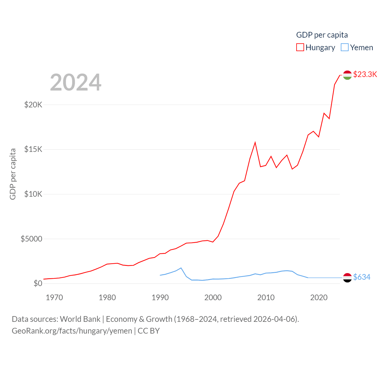 By GDP, Hungary ranks 55/197 ($223B) and Yemen ranks 125/197 ($21.6B). By GDP per capita, Hungary ranks 55/197 ($23,292), while Yemen ranks 191/197 ($634).
