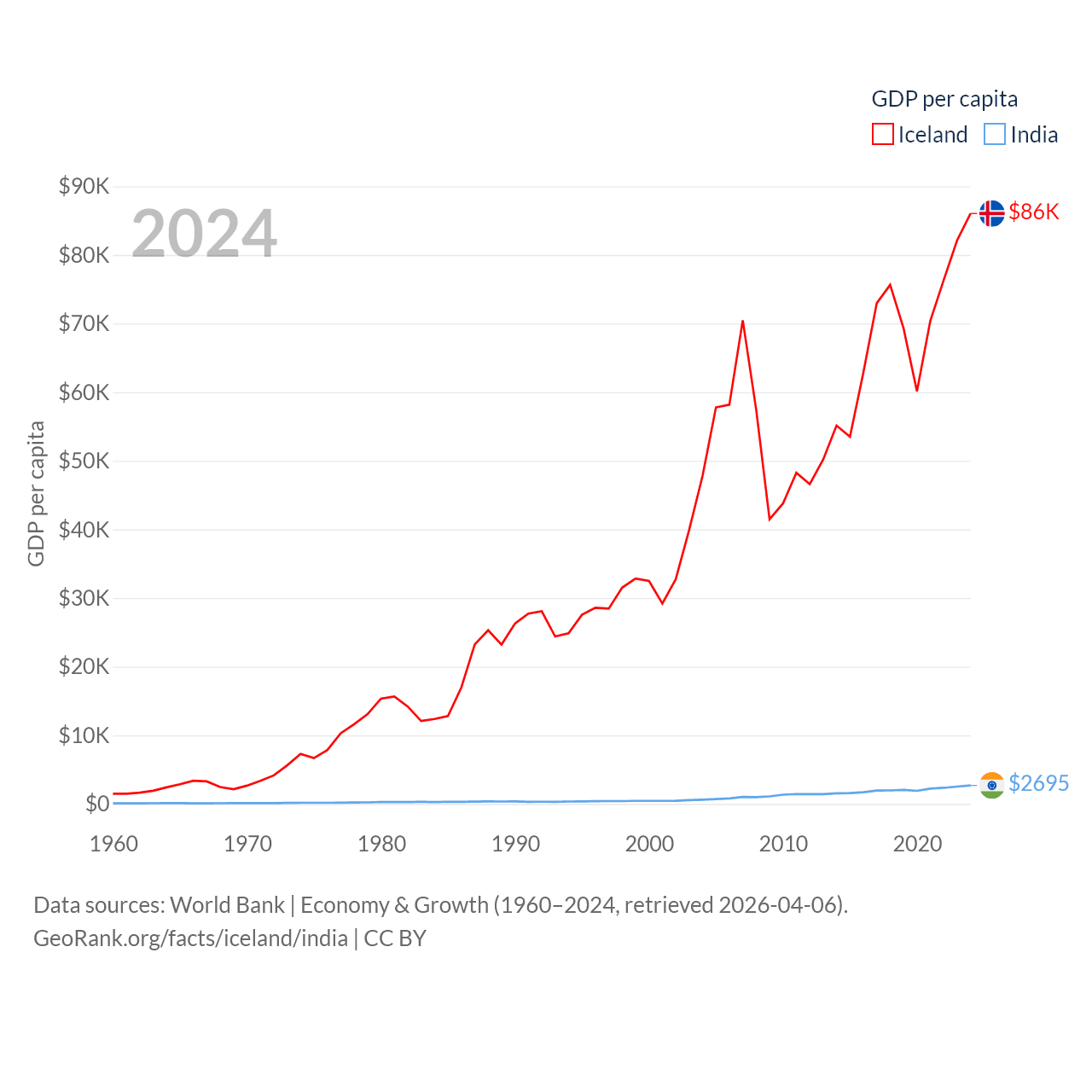 By GDP, Iceland ranks 108/197 ($33.3B) and India ranks 5/197 ($3.91T). By GDP per capita, Iceland ranks 9/197 ($86,041), while India ranks 143/197 ($2,695).