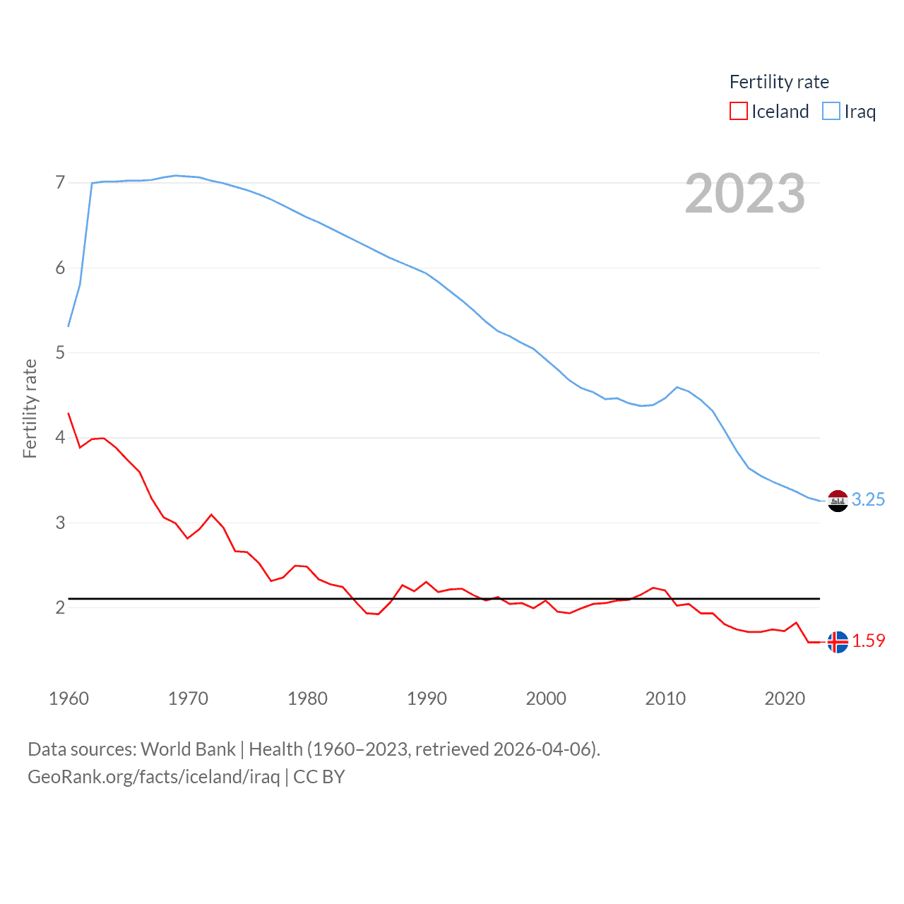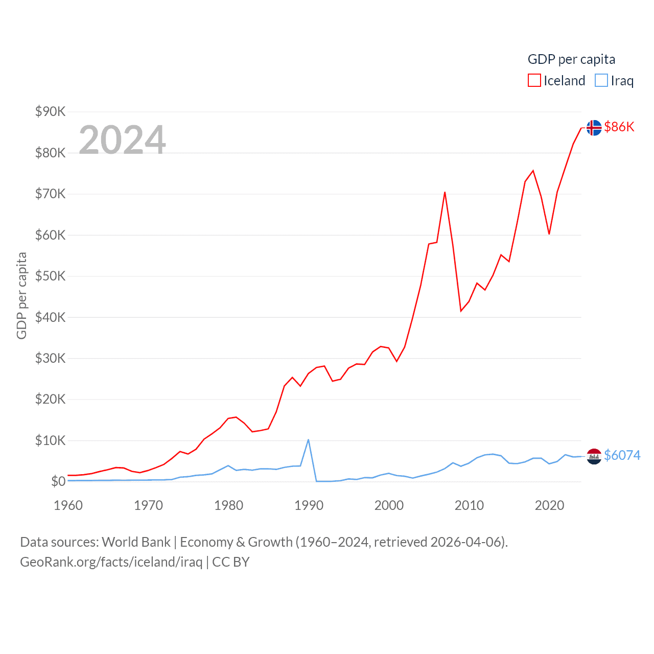 By GDP, Iceland ranks 108/197 ($33.3B) and Iraq ranks 50/197 ($280B). By GDP per capita, Iceland ranks 9/197 ($86,041), while Iraq ranks 113/197 ($6,074).
