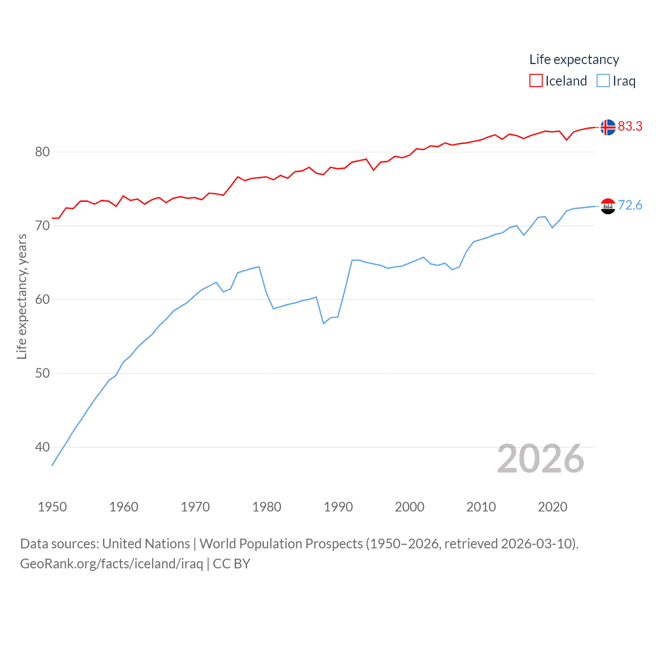 Iceland has a population of 387K (ranked 173/197), compared with 46M in Iraq (ranked 34/197). Iceland's land area is 38,931 sq mi versus 167,619 sq mi for Iraq (ranked 104th vs. 57th).