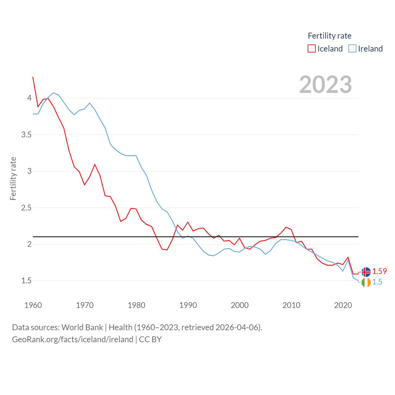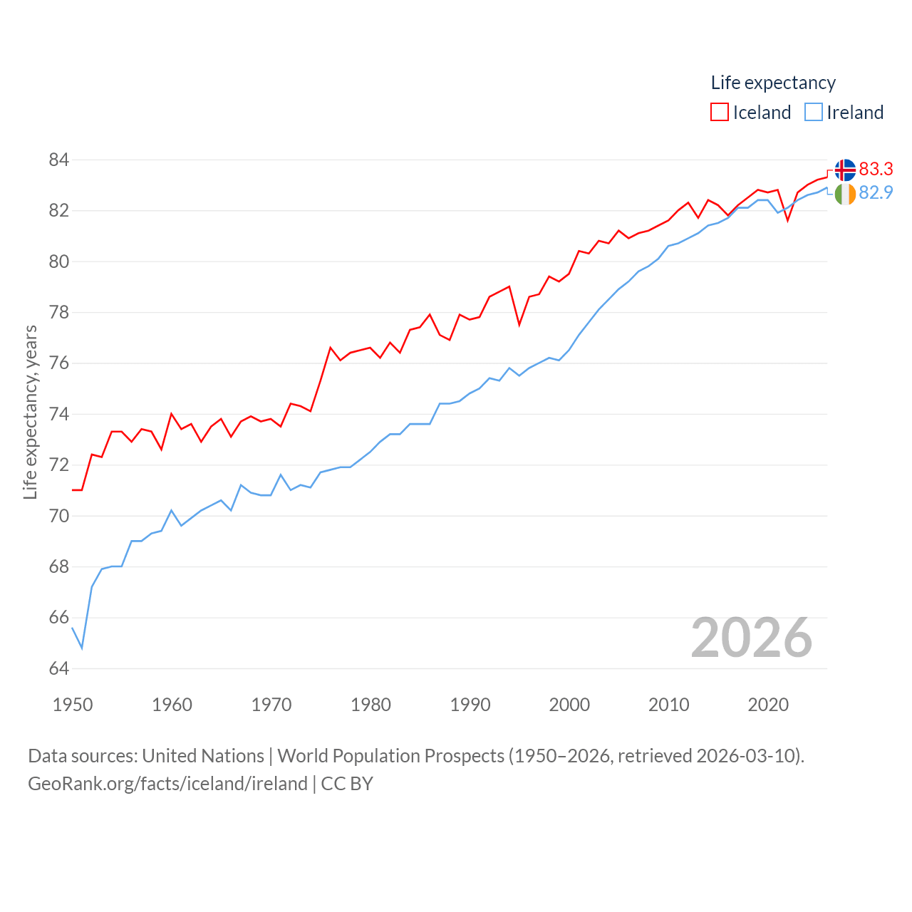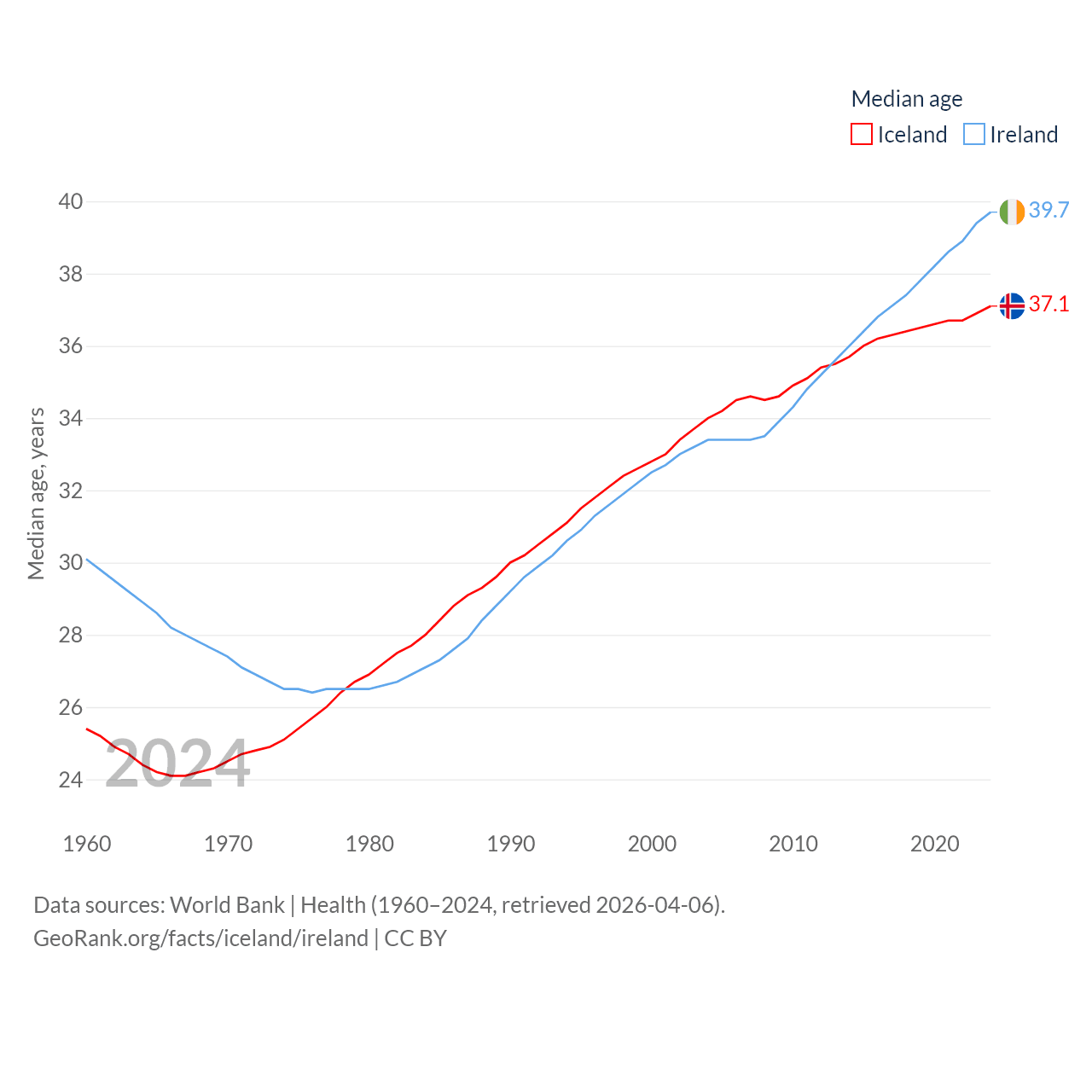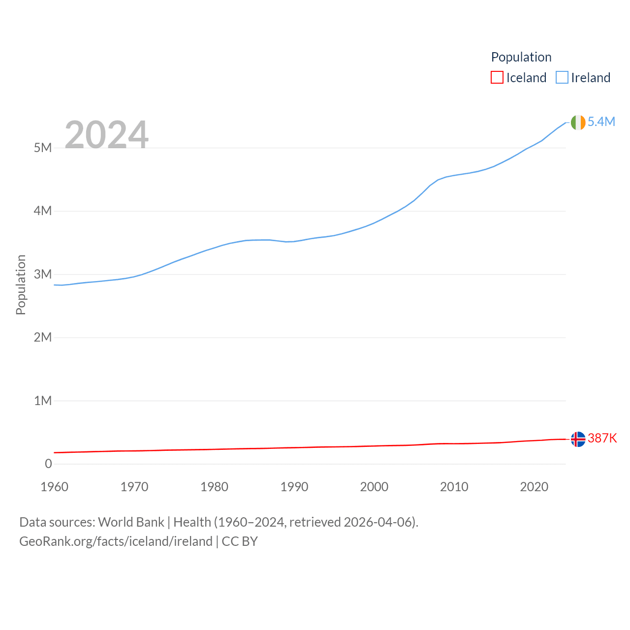 Iceland has a population of 387K (ranked 173/197), compared with 5.4M in Ireland (ranked 120/197). Iceland's land area is 38,931 sq mi versus 26,599 sq mi for Ireland (ranked 104th vs. 119th).