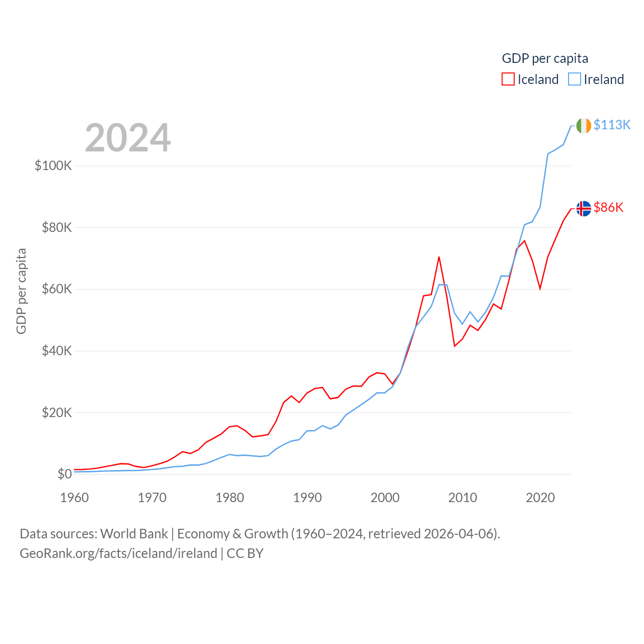 By GDP, Iceland ranks 108/197 ($33.3B) and Ireland ranks 25/197 ($609B). By GDP per capita, Iceland ranks 9/197 ($86,041), while Ireland ranks 4/197 ($112,895).