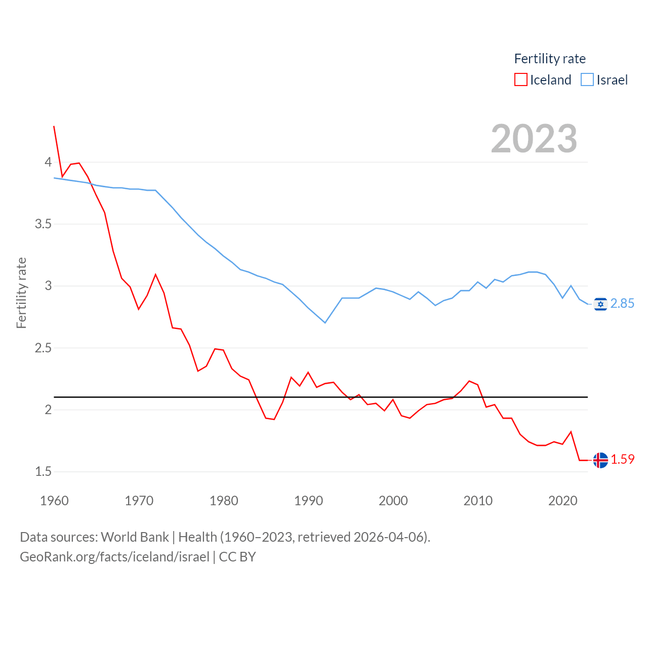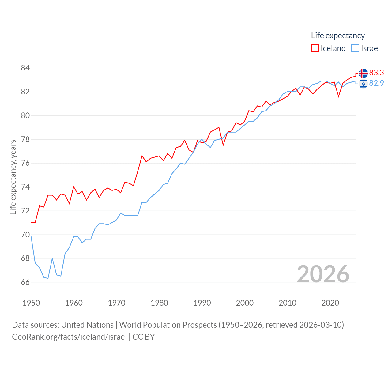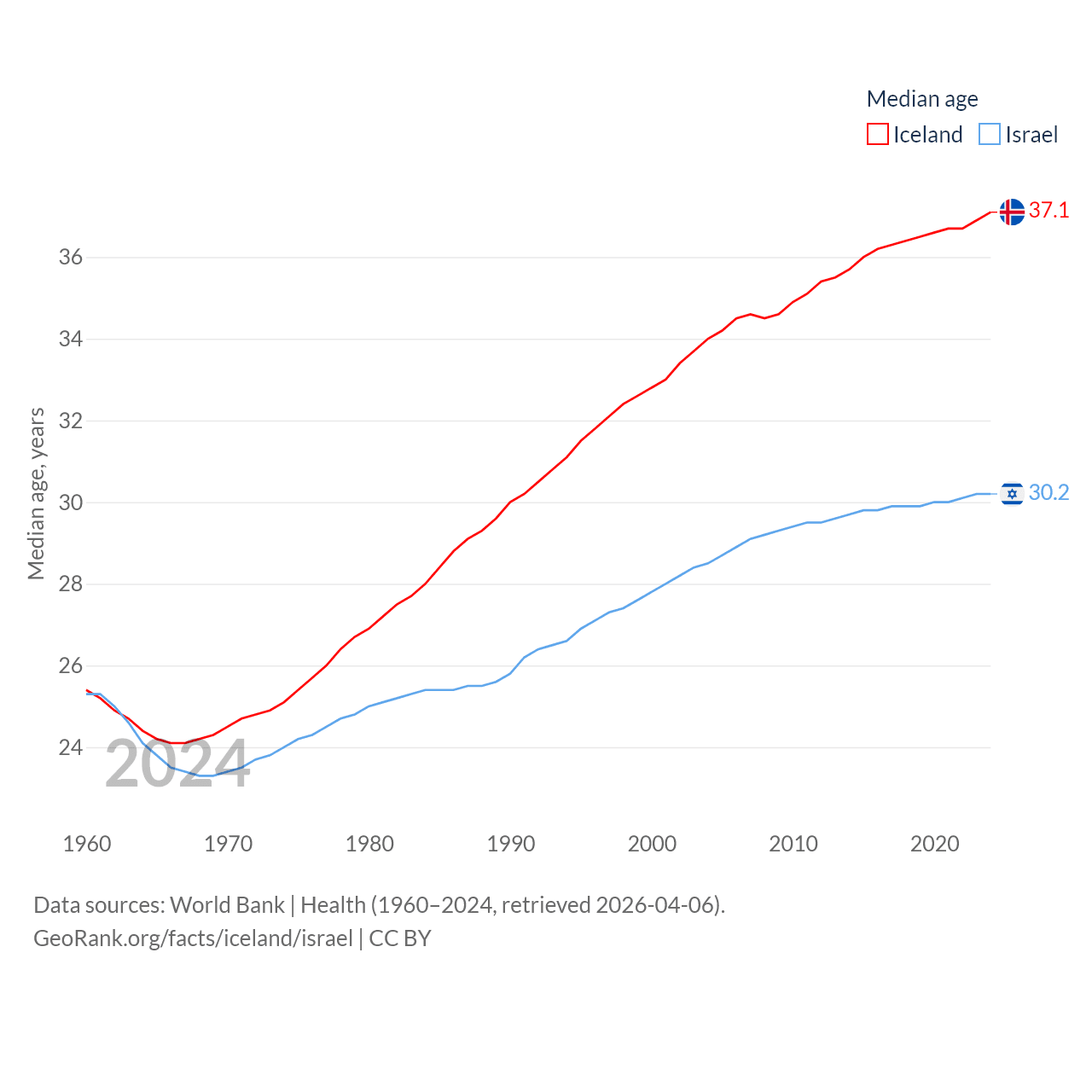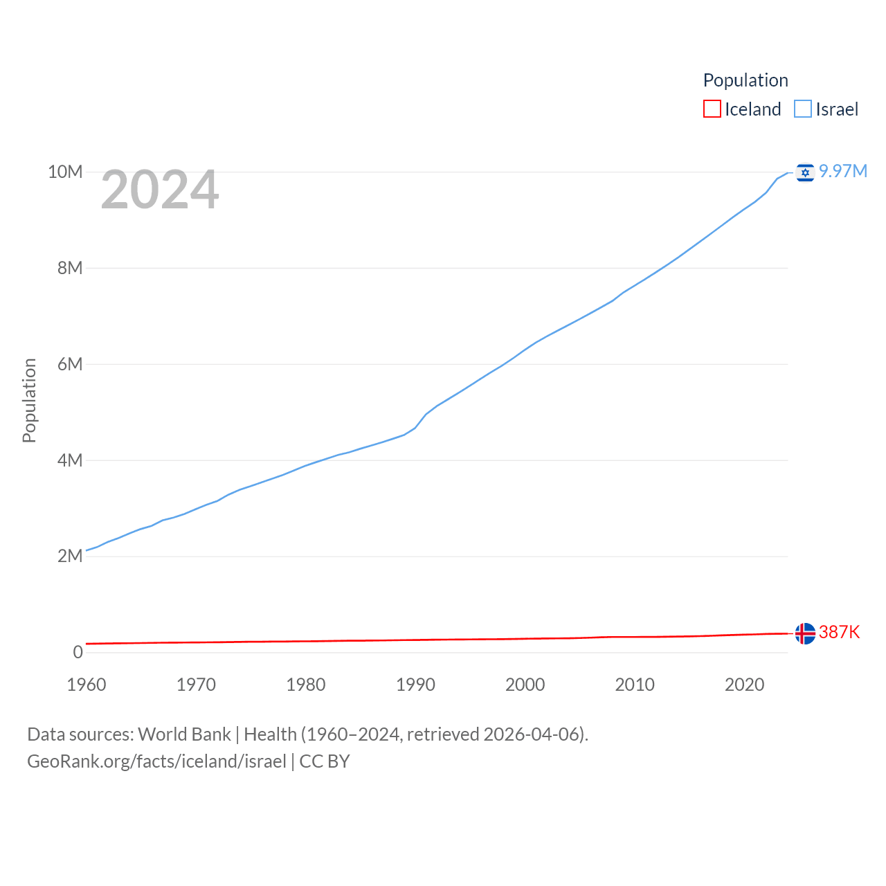 Iceland has a population of 387K (ranked 173/197), compared with 9.97M in Israel (ranked 96/197). Iceland's land area is 38,931 sq mi versus 8,355 sq mi for Israel (ranked 104th vs. 149th).