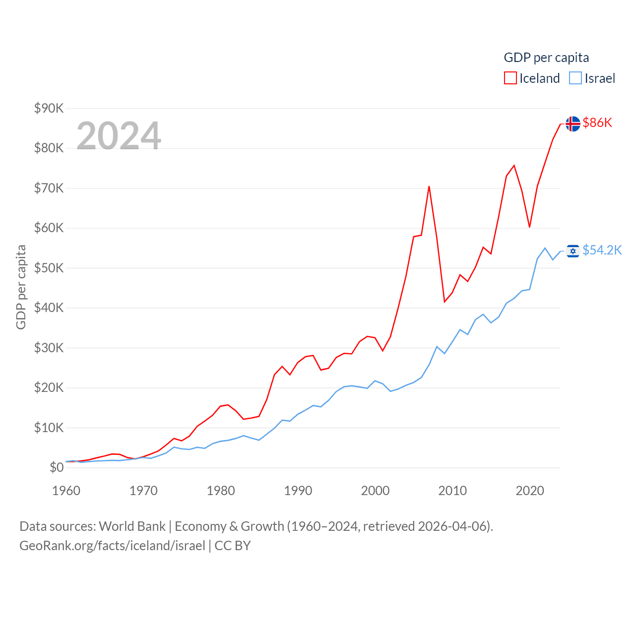 By GDP, Iceland ranks 108/197 ($33.3B) and Israel ranks 29/197 ($540B). By GDP per capita, Iceland ranks 9/197 ($86,041), while Israel ranks 21/197 ($54,177).