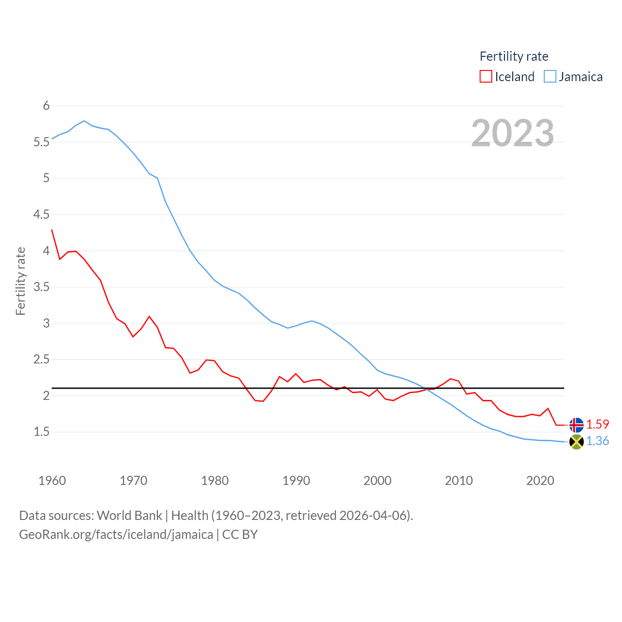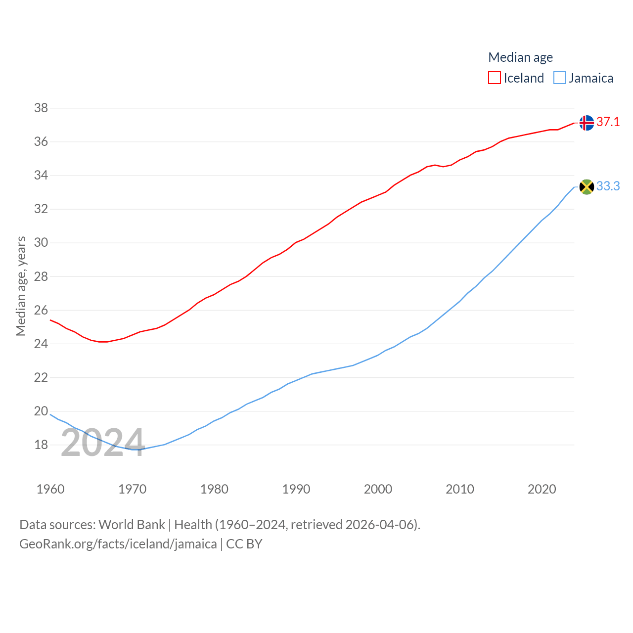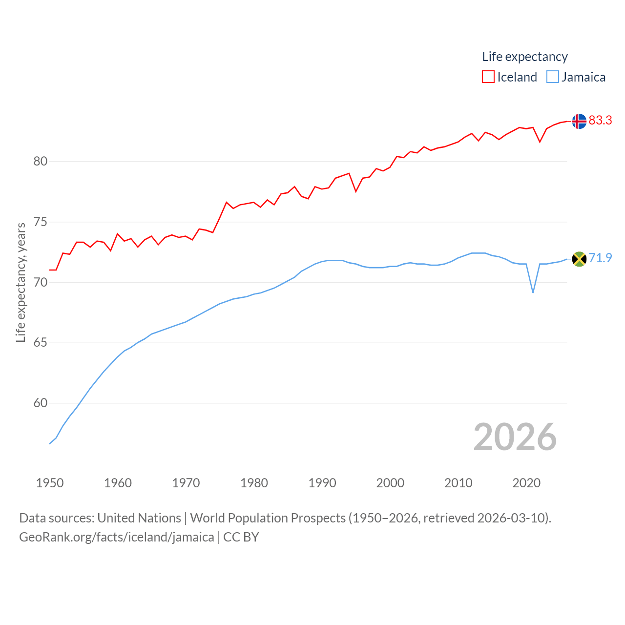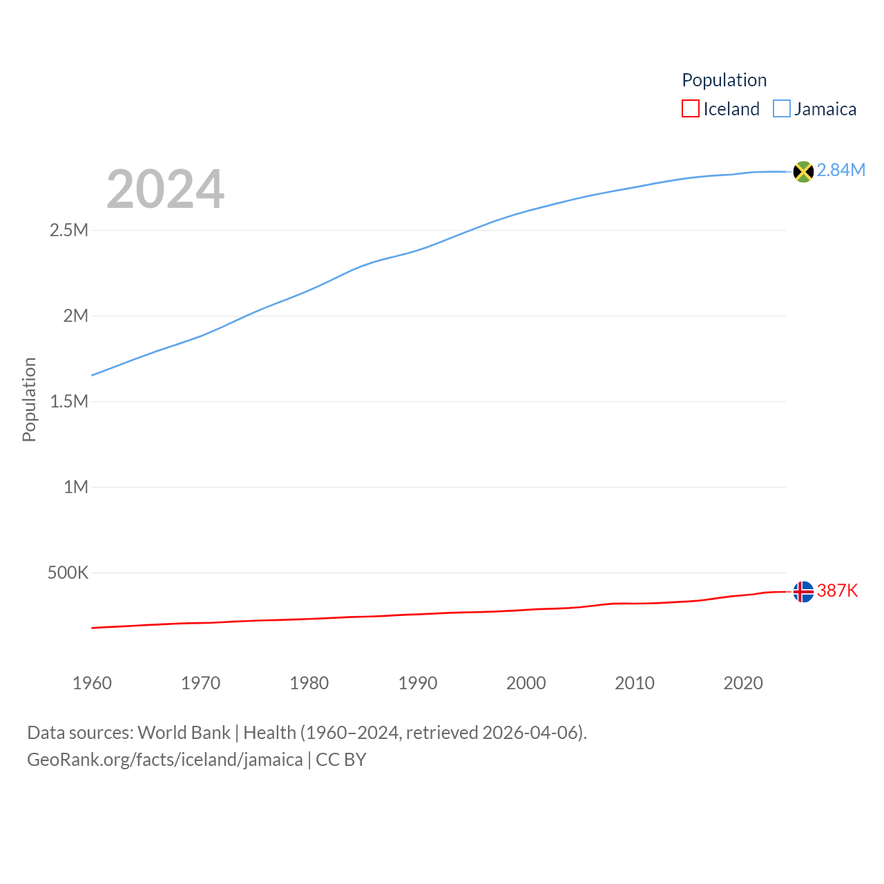 Iceland has a population of 387K (ranked 173/197), compared with 2.84M in Jamaica (ranked 139/197). Iceland's land area is 38,931 sq mi versus 4,181 sq mi for Jamaica (ranked 104th vs. 159th).