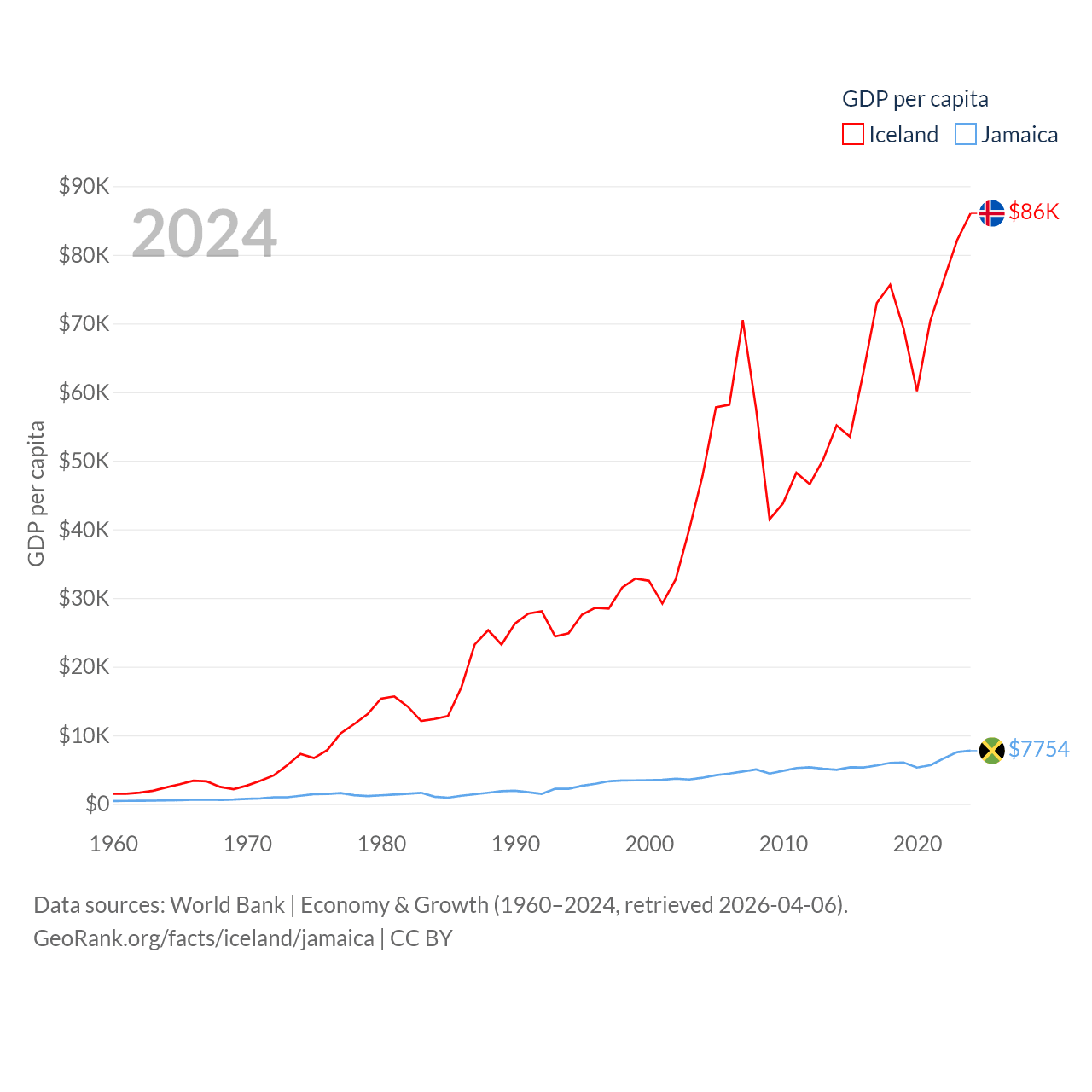 By GDP, Iceland ranks 108/197 ($33.3B) and Jamaica ranks 124/197 ($22B). By GDP per capita, Iceland ranks 9/197 ($86,041), while Jamaica ranks 95/197 ($7,754).