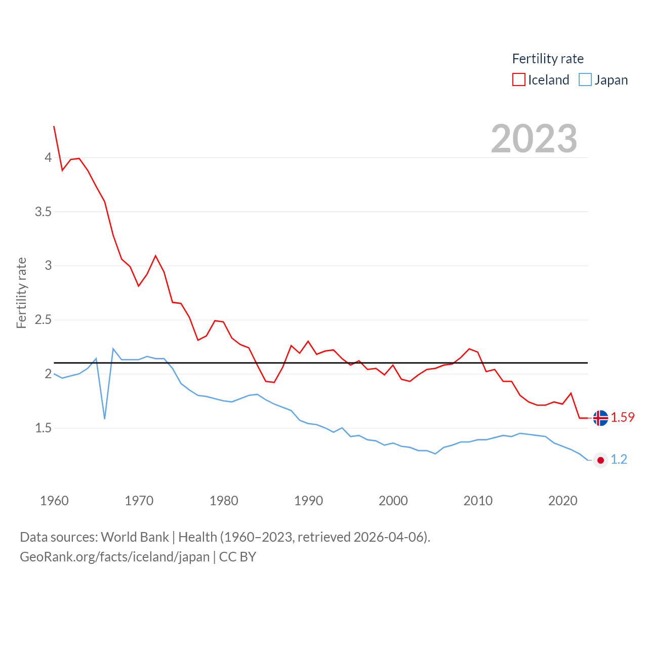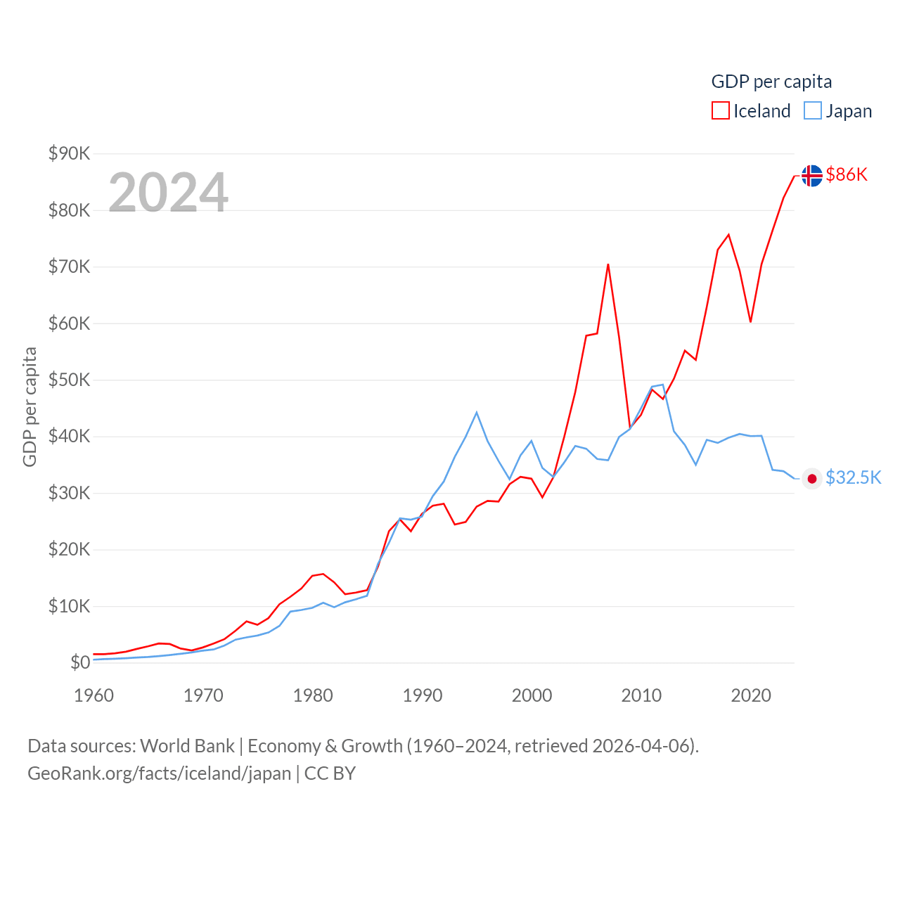 By GDP, Iceland ranks 108/197 ($33.3B) and Japan ranks 4/197 ($4.03T). By GDP per capita, Iceland ranks 9/197 ($86,041), while Japan ranks 38/197 ($32,487).