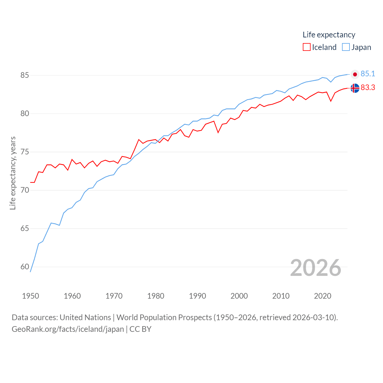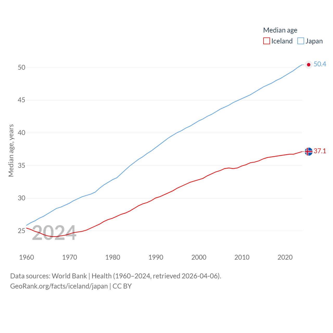 Iceland has a population of 387K (ranked 173/197), compared with 124M in Japan (ranked 12/197). Iceland's land area is 38,931 sq mi versus 140,761 sq mi for Japan (ranked 104th vs. 61st).