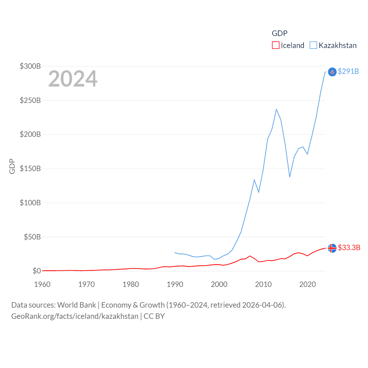 By GDP, Iceland ranks 108/197 ($33.3B) and Kazakhstan ranks 48/197 ($291B). By GDP per capita, Iceland ranks 9/197 ($86,041), while Kazakhstan ranks 71/197 ($14,155).