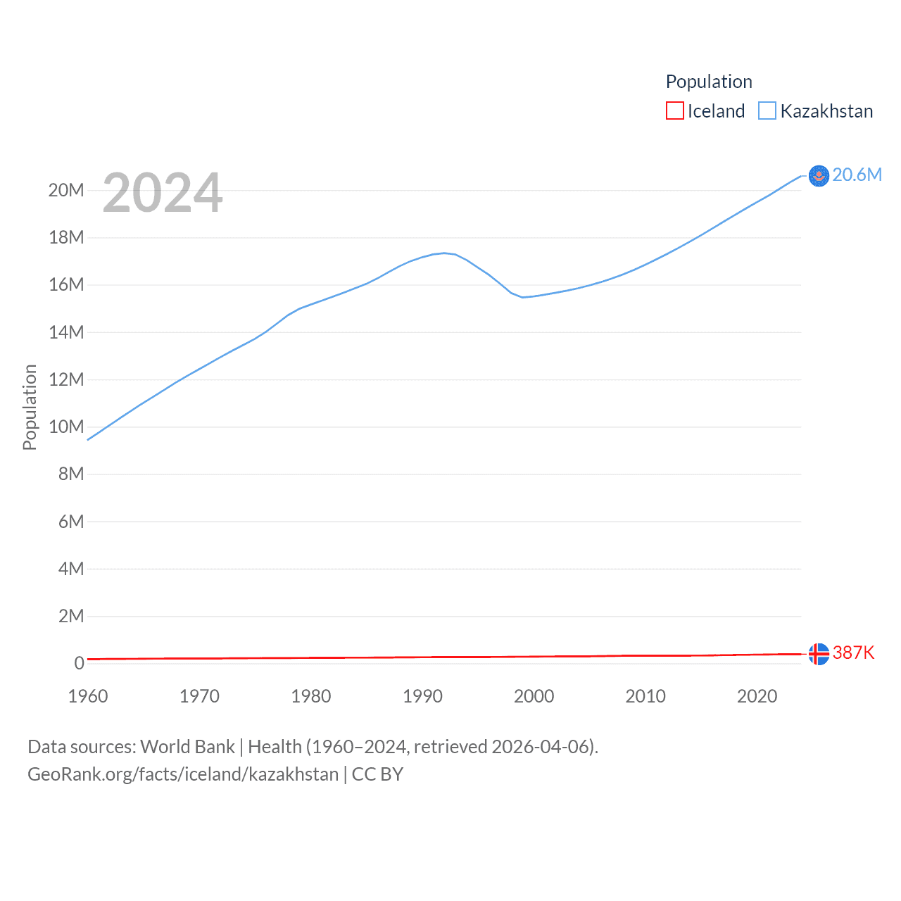 Iceland has a population of 387K (ranked 173/197), compared with 20.6M in Kazakhstan (ranked 64/197). Iceland's land area is 38,931 sq mi versus 1,042,360 sq mi for Kazakhstan (ranked 104th vs. 9th).
